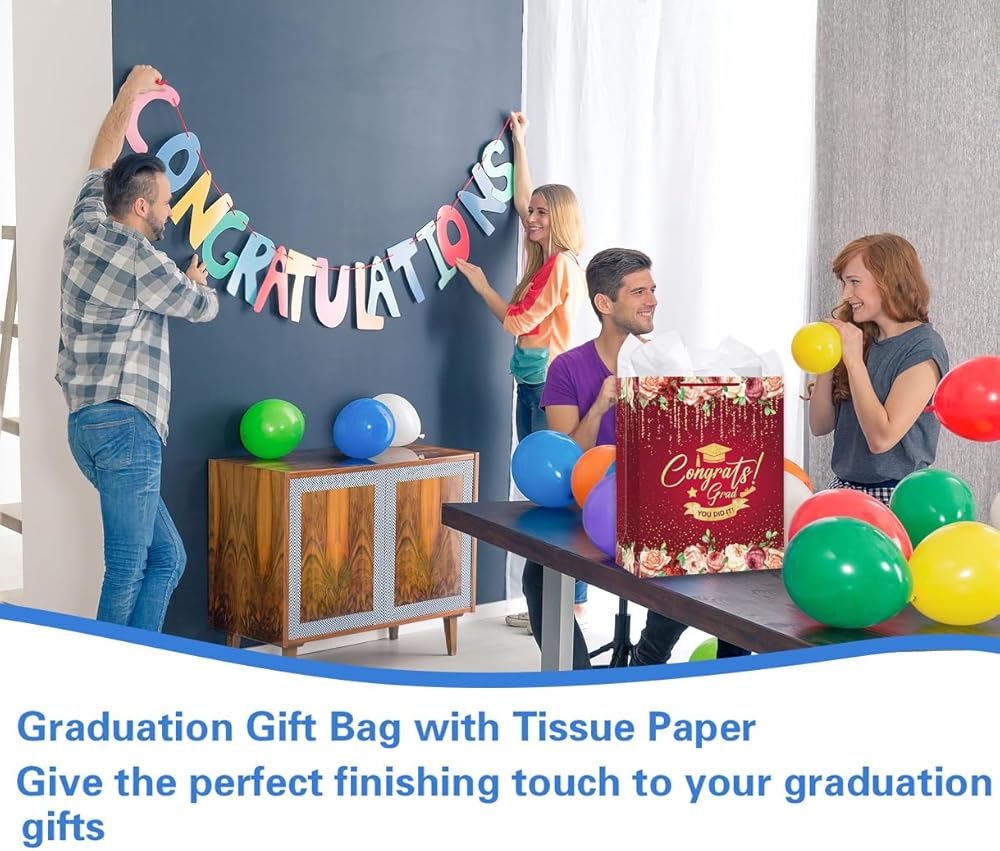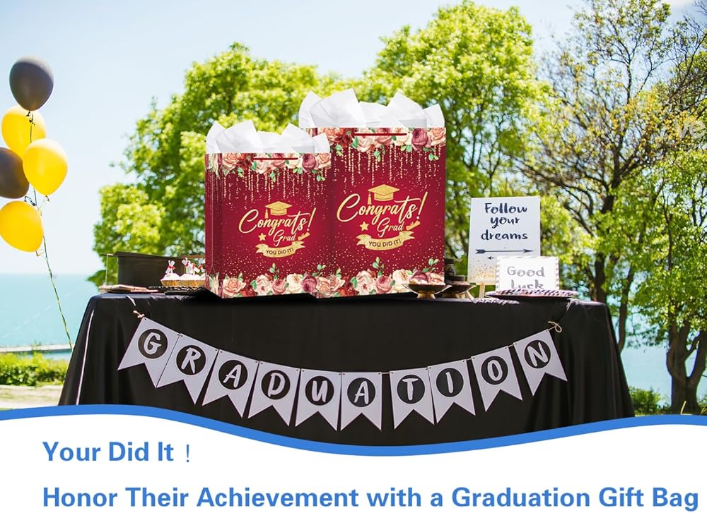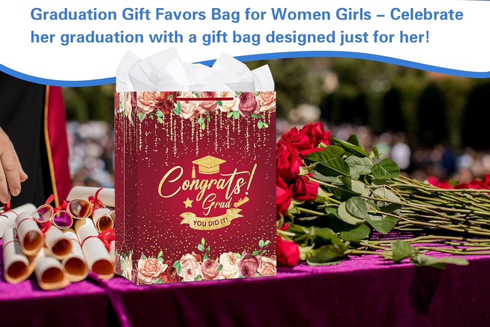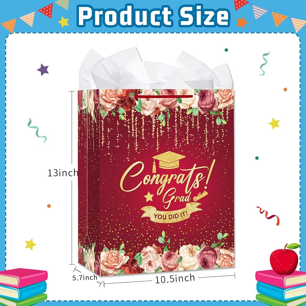• Spacious and Practical Graduation Goodie Bags: With dimensions of 13" x 10.5" x 5.8", this generous bag offers ample space for graduation gifts and party favors. It also comes with gift bags with tissue paper for easy wrapping, making it an ideal solution for a polished presentation.
