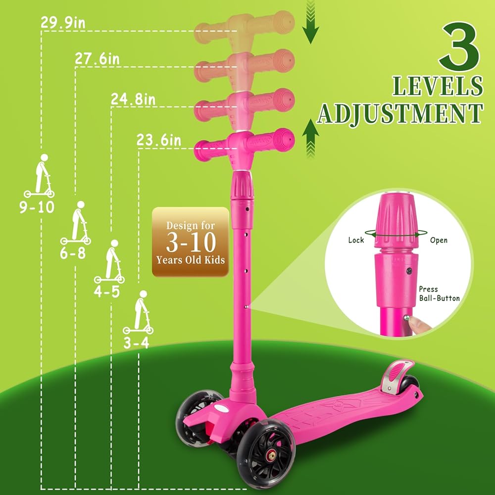 - ارتفاع قابل للتعديل من أربعة مستويات: يمكن ضبط المقاود المضغوطة في سكوتر إلى أربعة ارتفاعات (23.6 ، 24.8 ، 27.6 ، و 29.9 بوصة) ، استيعاب الأطفال المتناميين الذين تتراوح أعمارهم بين 3 و 10 سنوات ، مما يضمن رحلة مريحة مع نموها