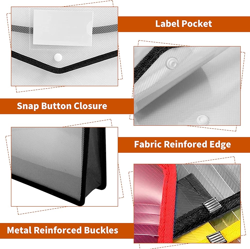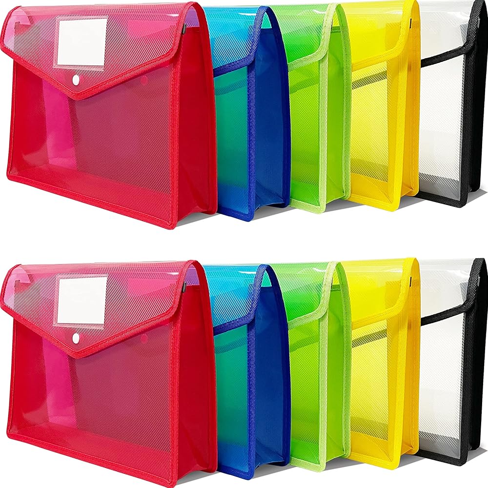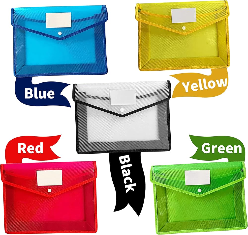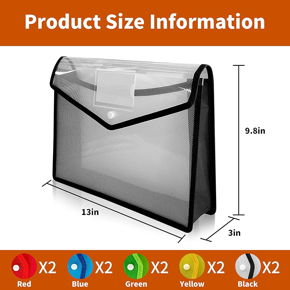 Package includes: You can get 10 pcs document folders in 5 different colors,2 black, 2 blue, 2 green, 2 yellow and 2 red, each A4 document holder folder color is semitransparent design, which makes it easy to organize and distinguish between different file.
