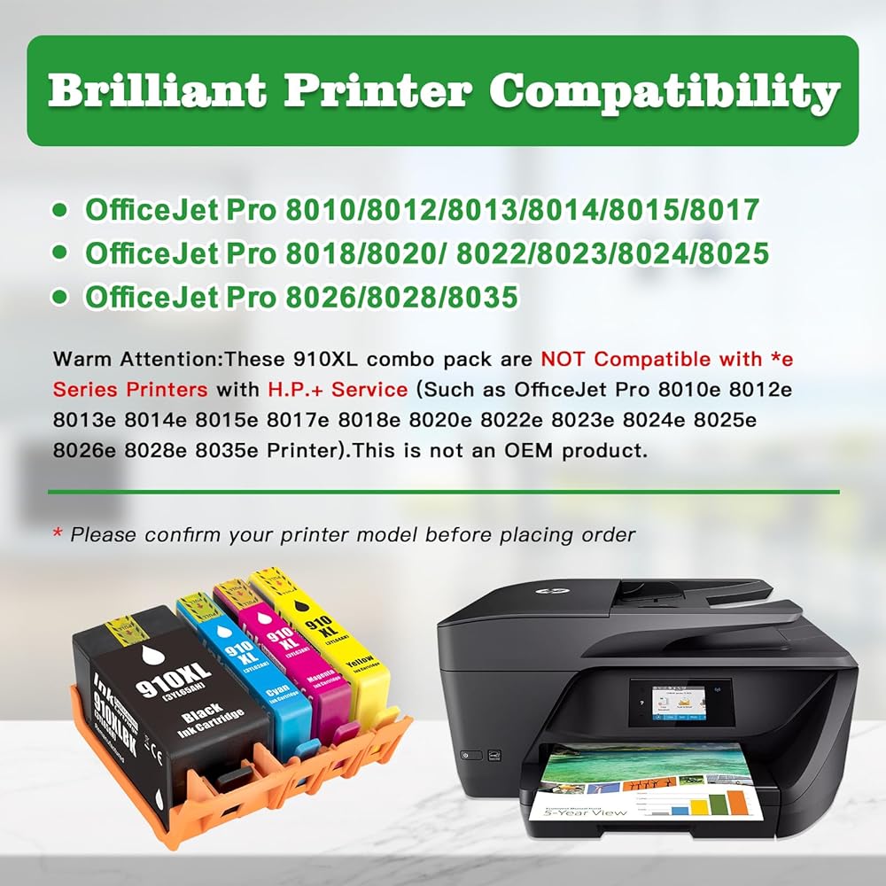 Warm Attention:These 910xl combo pack are NOT Compatible with *e Series Printers with HP+ Service (Such as OfficeJet 8010e 8012e 8013e 8014e 8015e 8017e 8018e 8020e 8022e 8023e 8024e 8025e 8026e 8028e 8035e Printer).This is not an OEM product.
