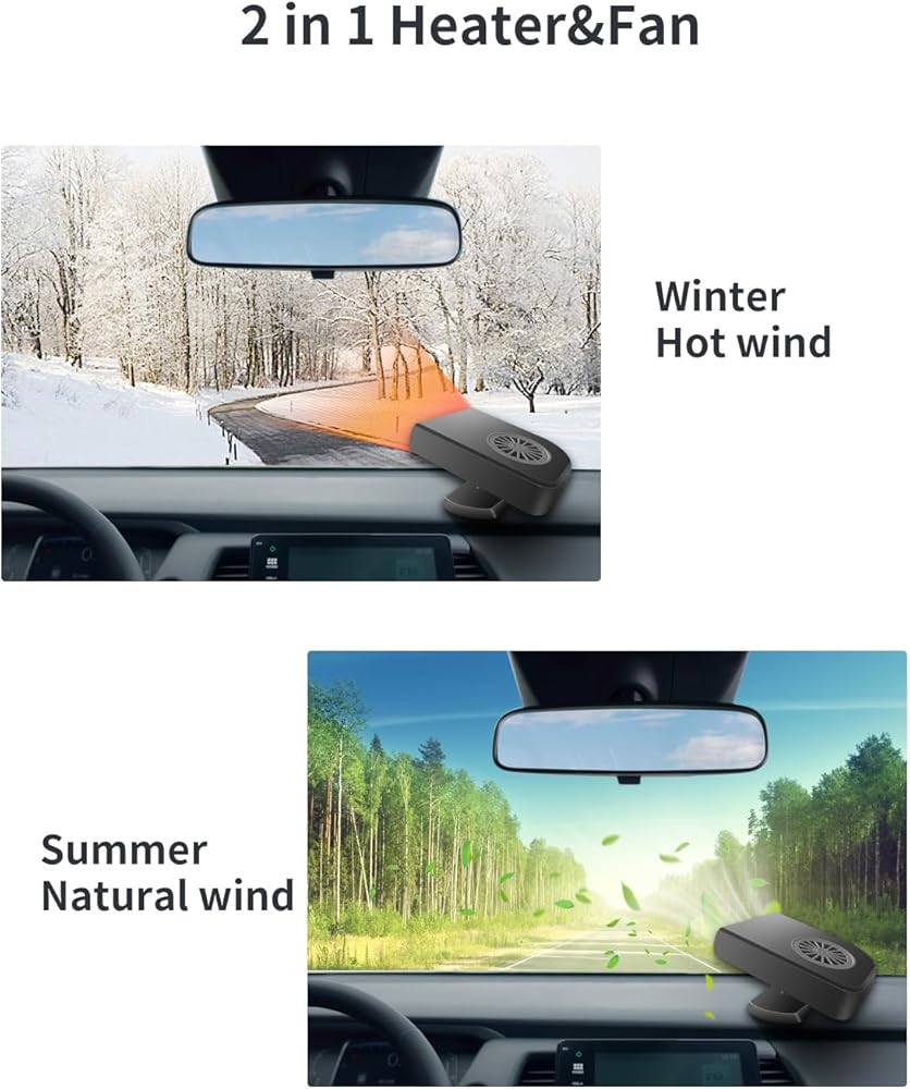 2 في مروحة سخان واحدة: سخان ، 60 ثانية تسخين سريع ، زيادة درجة حرارة مساحة السيارة. مروحة ، تقوم بتعميم الهواء داخل السيارة لإزالة الرائحة الغريبة