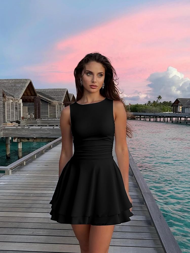 • تتميز هذه الفساتين القصيرة بالنادي عن رقبة الطاقم ، أعلى الخزان ، فوق طول الركبة الصغيرة ، تنحنح الكشكش ، خصر الباسك