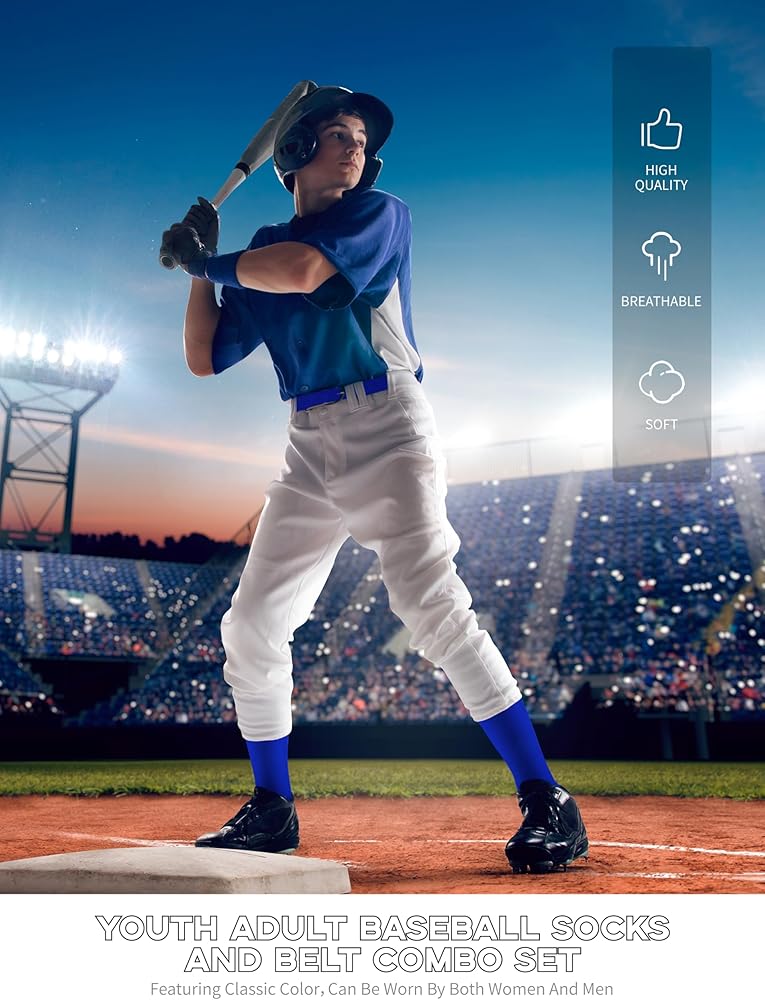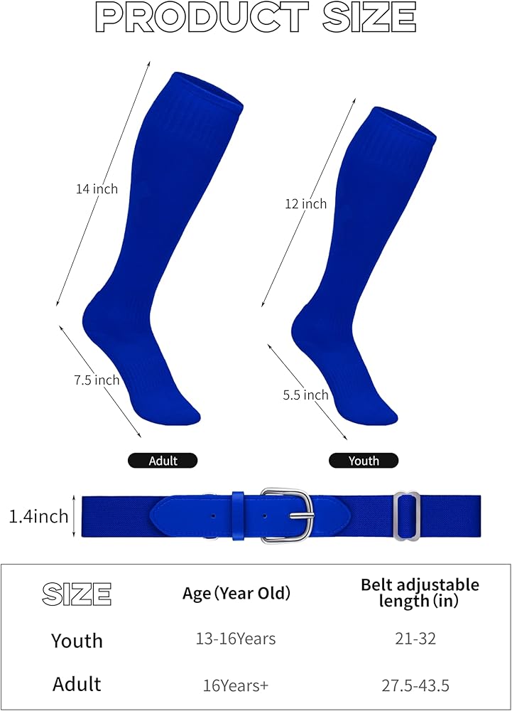 جوارب البيسبول البالغة للشباب ومجموعة الحزام: تشمل جوارب البيسبول ومجموعة الحزام لدينا جوارب بيسبول وحزام واحد يناسب معظم أحجام الخصر للبالغين للحصول على حل مثالي جاهز للعبة