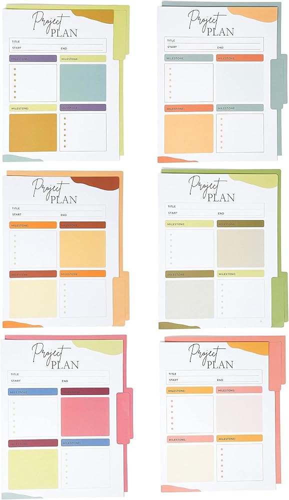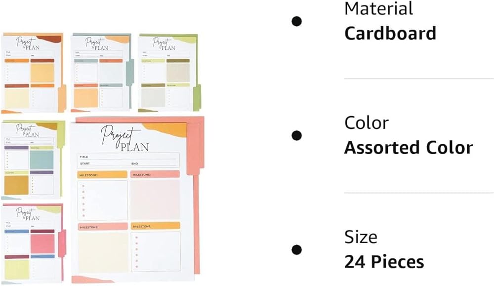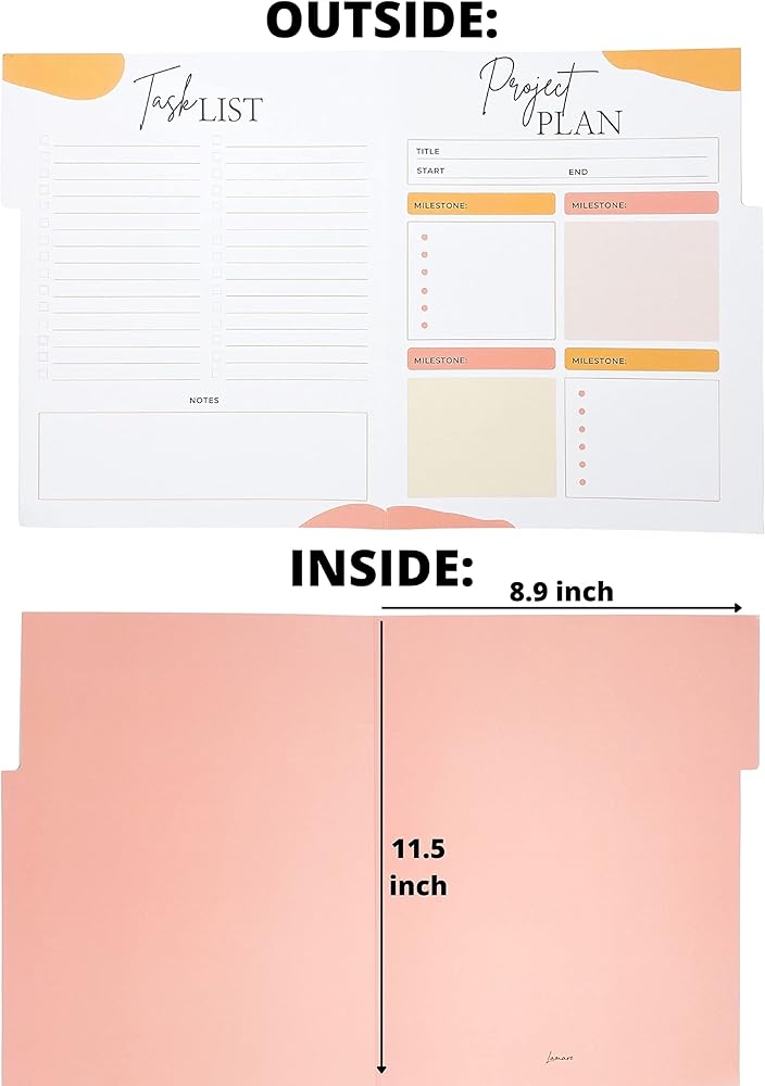 خطط لمشاريعك وابق منظمًا: على عكس مجلدات ملفات المشاريع الأخرى، تتميز Lamare للقيام بمجلدات الملفات بنظرة عامة بسيطة على مشاريعك. نظرة سريعة ويمكنك معرفة مكان وجودك بسرعة في المشروع مما يسمح لك بقضاء وقت أقل في التنظيم ومزيد من الوقت للإنتاجية باستخدام بديل حجم الحروف لمجلدات الملفات الملونة.