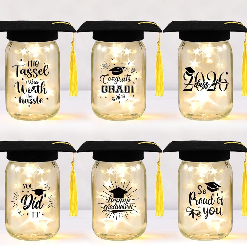 مجموعة ديكور التخرج الكاملة: مجموعة ديكورات جرة التخرج لعام 2025 ، بما في ذلك ستة جرار ماسون مضاءة تضم مطبوعات فريدة من نوعها مثل "تهانينا غراد" ، "أنت فعلت ذلك" ، "فئة 2025" ، شعر 6pcs بأغطية التخرج*6 ، 6 أوراق من الورق الكهروضوئية (وضعت بشكل عشوائي في النمط العادي أو العلامة). هدايا التخرج الإبداعية هذه تجعل التذكارات المدروسة والزخرفية التي تحتفل بمنظرها الخاص