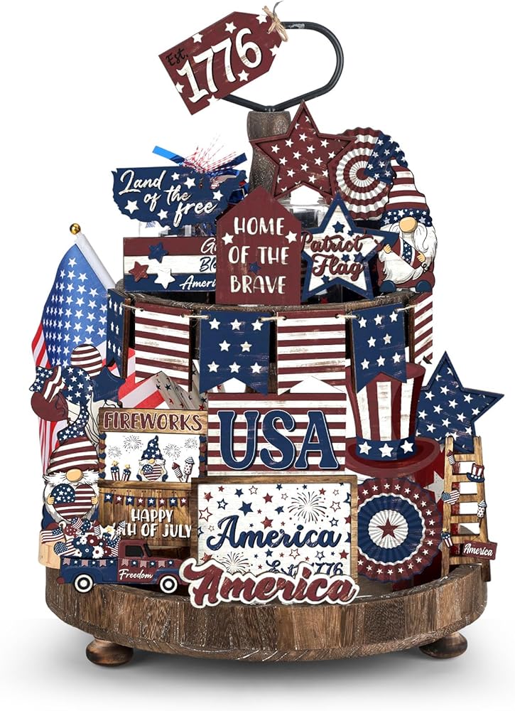 Create a festive, patriotic atmosphere in your home or office with these patriotic tiered tray decors. The patriotic colors and elements add a touch of charm and festivity, ideal for your Independence Day celebration.