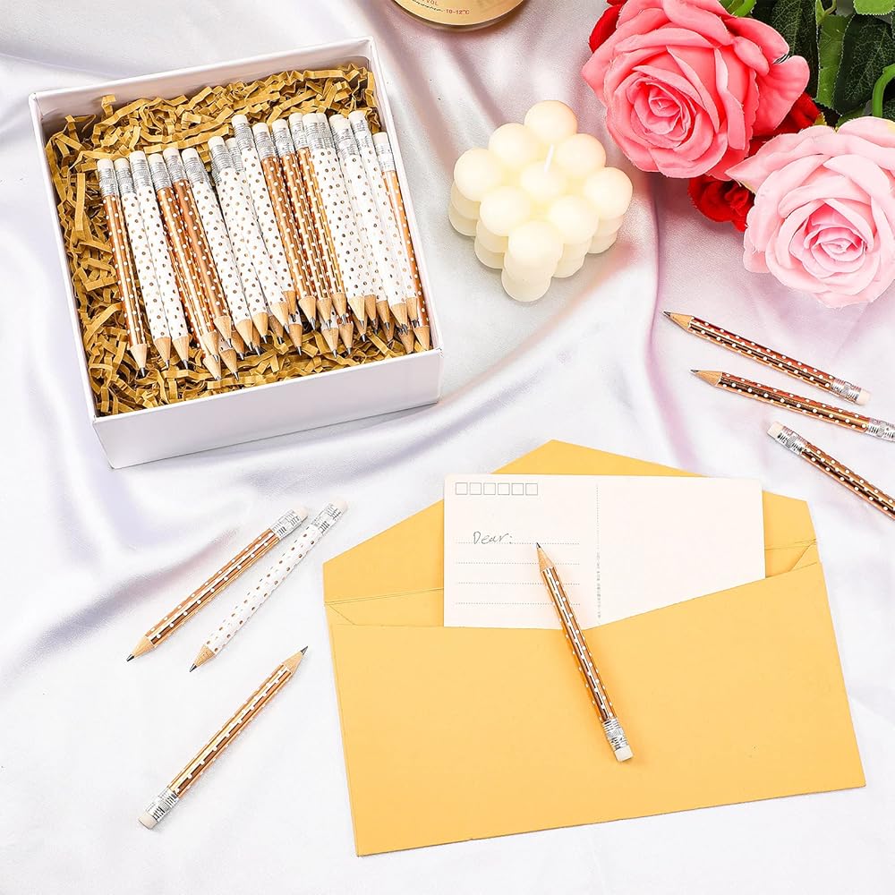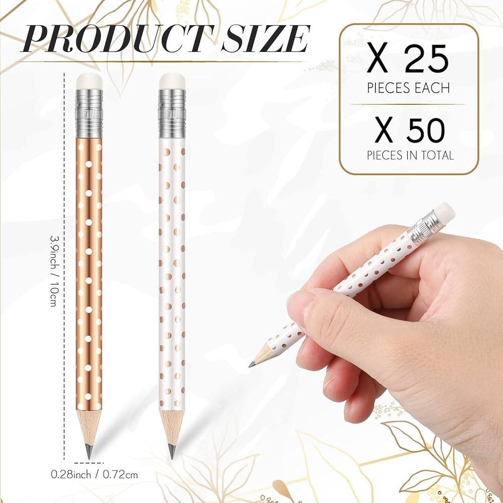 2 Styles of Half Pencils: you will receive 50 small pencils in 2 styles, rose gold with white polka dots and white rose gold with polka dots, 25 of each, measuring approximately 4 inches long, enough pencils for you to share with people who come to the bride for gifts