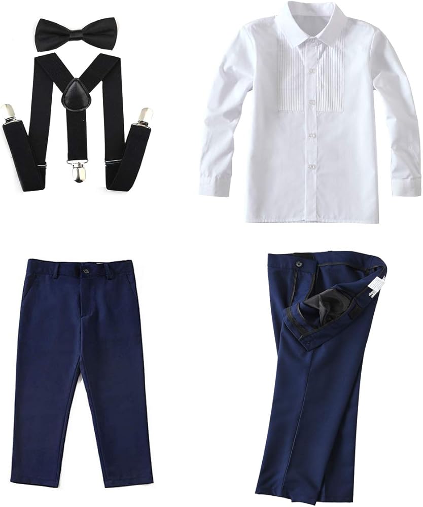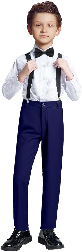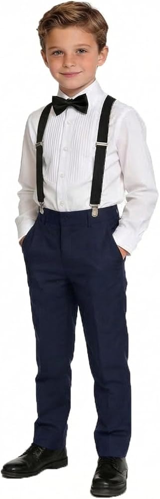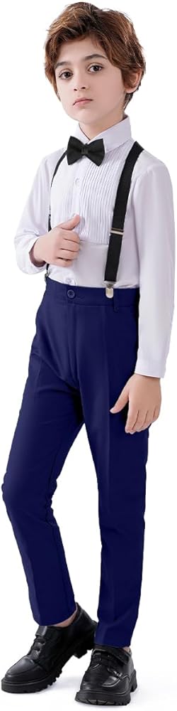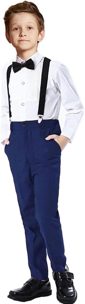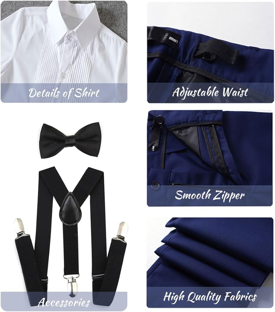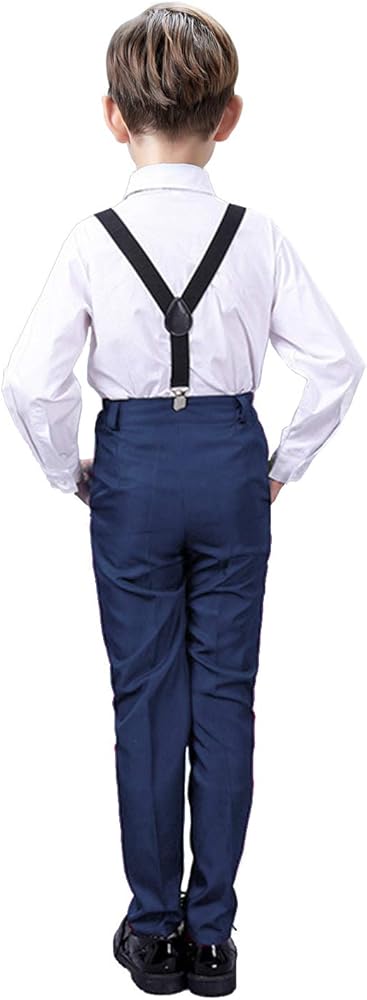 • Complete 4 pieces boys suits set:1*suspender,1*black pants,1*white shirt,1*black bow tie