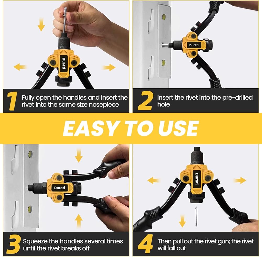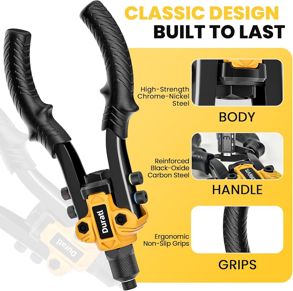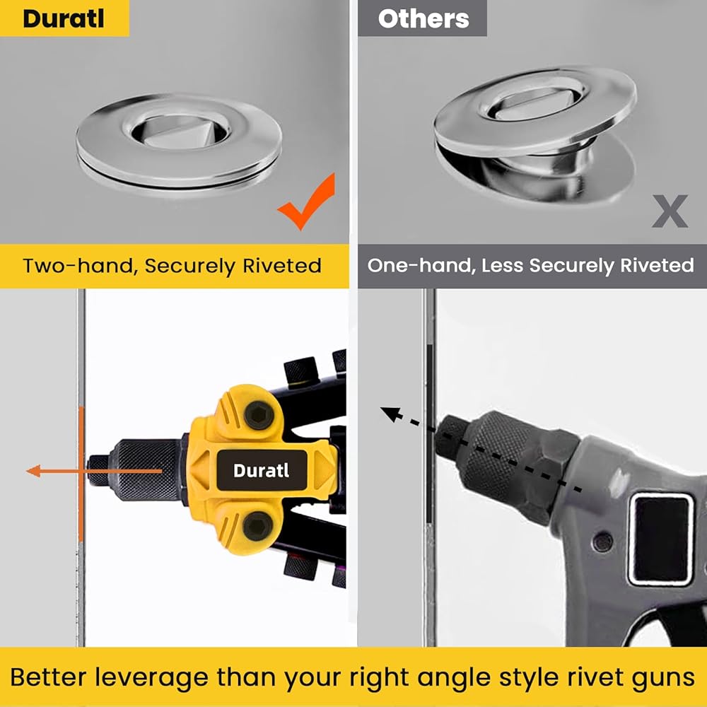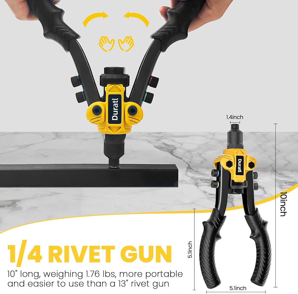 1/4 بوصة بندقية برشام شاقة: يحتوي مسدس برشام Duratl البوب على مقابض طويلة 10 بوصات للحصول على رافعة كافية ، مما يؤدي بسهولة إلى تثبيت مسار قطر كبير 1/4 بوصة ؛ بتصميم ثنائي اليدين ، إنه أكثر جهدًا ويعمل أكثر سلاسة من تلك التي يدي ؛ عند 1.76 رطل فقط ، يكون أكثر إحكاما وأخف وزناً من أداة برشام البوب 13 بوصة