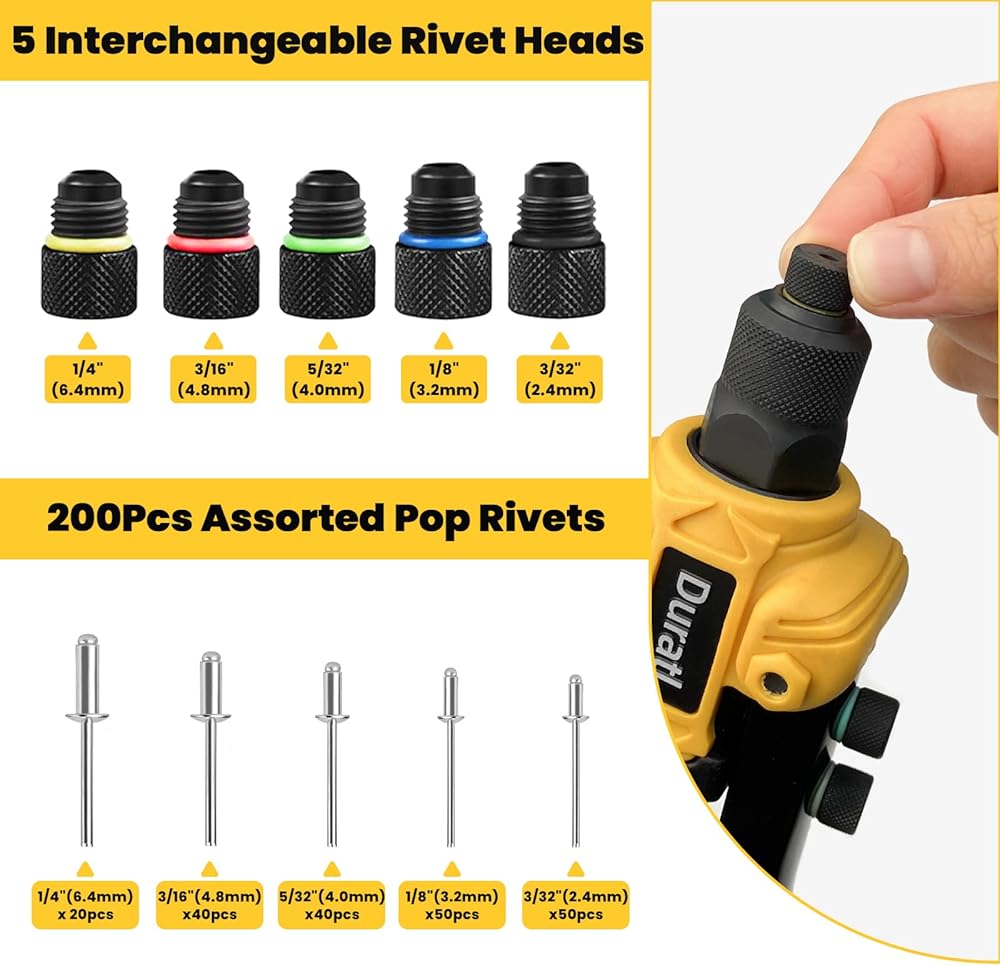 مجموعة All-In-One: تأتي مجموعة Gun Rivet مع أداة بندقية برشام مقاس 10 بوصات ، و 200 مسامير من الألومنيوم ، و 5 أخلاق متعددة الاستخدامات (1/4 "، 3/16" ، 5/32 "، 1/8" ، 3/32 ")