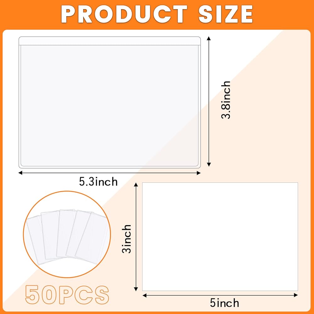 Yzzsjc 50 Pack Self-Adhesive Index Card Holder 3.8 x 5.3 Inch Clear Plastic Library Card Pockets Adhesive Label Holder Card Holder with 60pcs Index Cards for Organizing and Protecting Cards or Photos