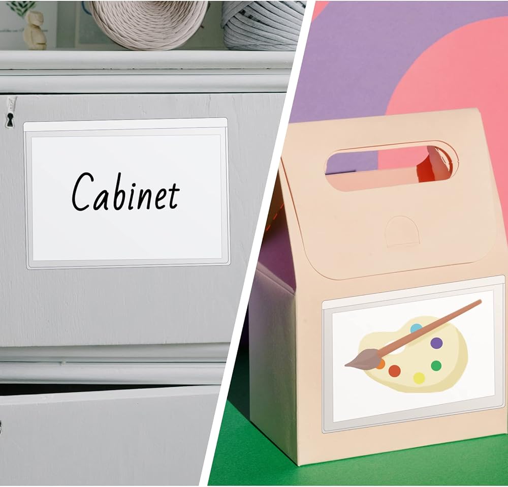 Wide application:These adhesive pocket labels are usually used for marking and sorting. The clear pocket sleeves for index cards are suitable for dustbins, handbags, photo albums, boxes, drawers, containers, books, desks, lockers, etc.