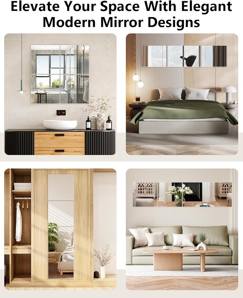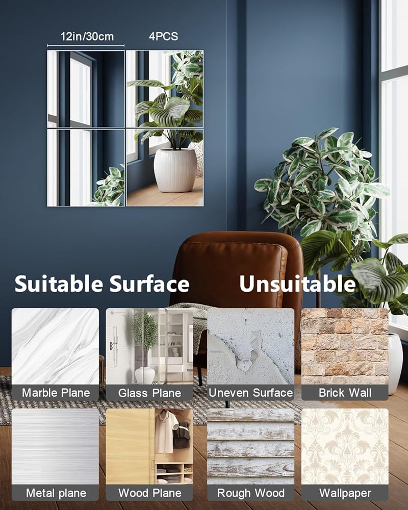مرايا الجدار قياس : 12 '× 12' '، إجمالي 4 قطع ، فهي توفر انعكاسات واضحة وخالية من التشويه. شراء مجموعات متعددة لإنشاء ترتيبات زخرفية مختلفة في منزلك.