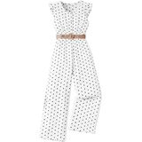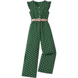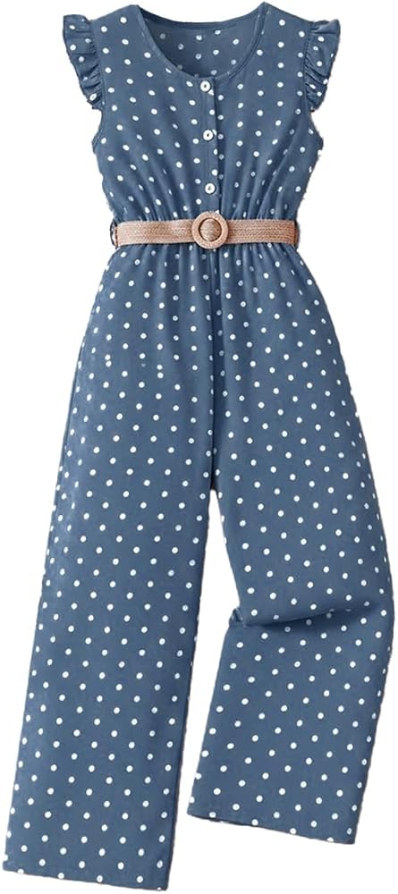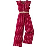 With vibrant colors and excellent elasticity, this ensemble ensures both style and comfort. The set features a sleeveless red jumpsuit adorned with white polka dot patterns, with the top part adorned with three buttons that can be opened or closed for added versatility. The waist belt not only provides adjustable fit but also serves as a decorative accent.