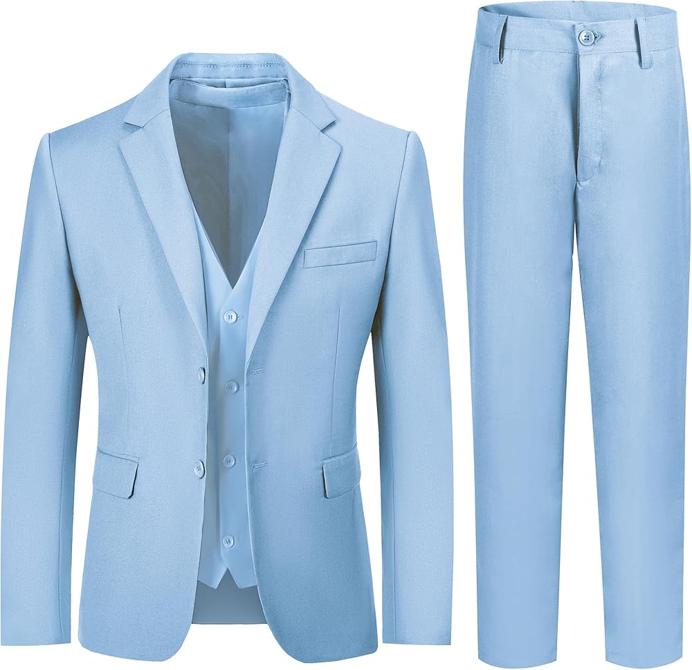 3 Piece Set: This boys formal suits includes a classic suit jacket,a suit vest with an adjustable buckle , and an adjustable waist suit pants. Toddler suit: size 2t,3t,4t,5,6;Boys suit: size 7,8,10,12,14,16;Youth teen suit: size 18-20.
