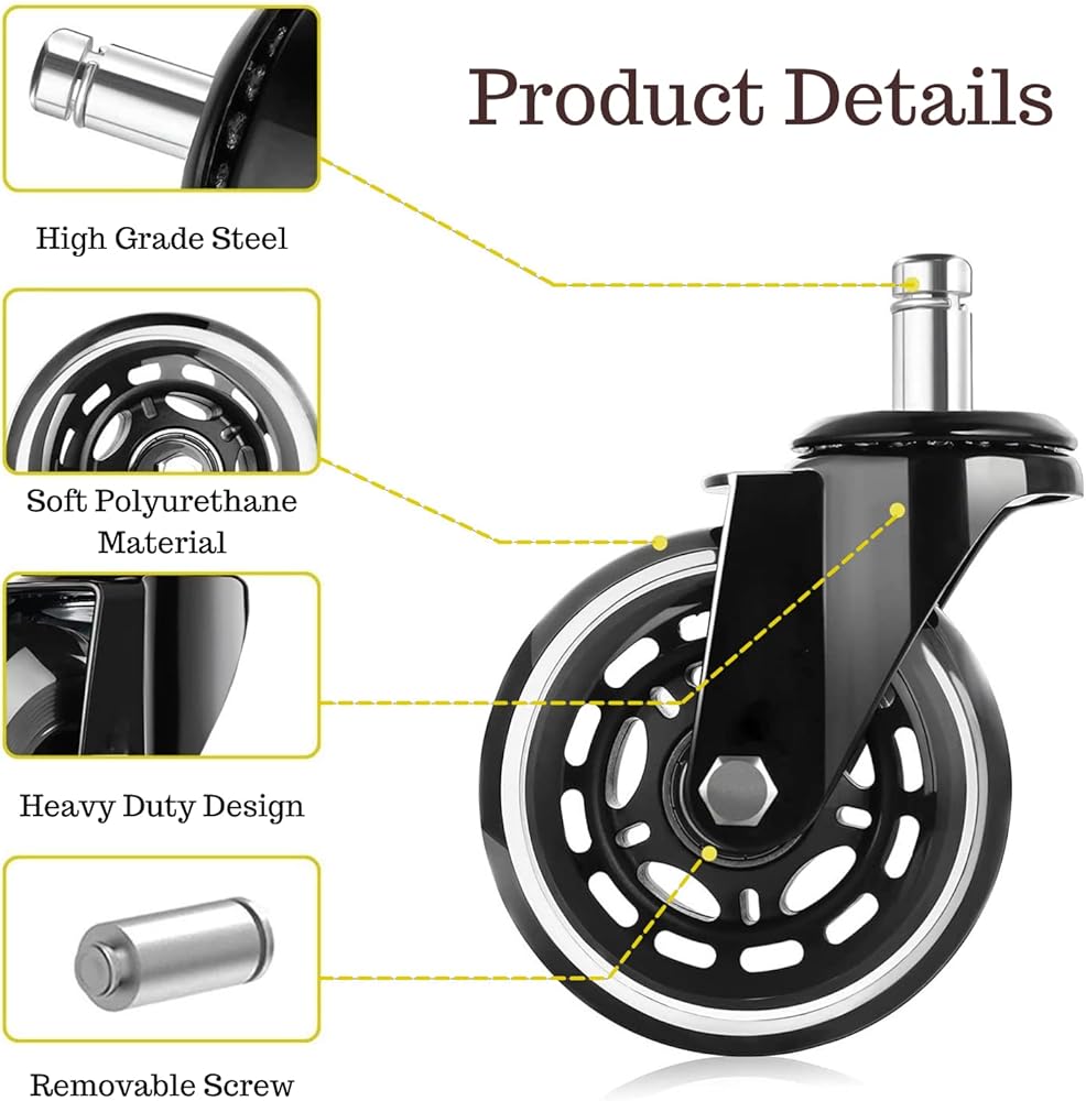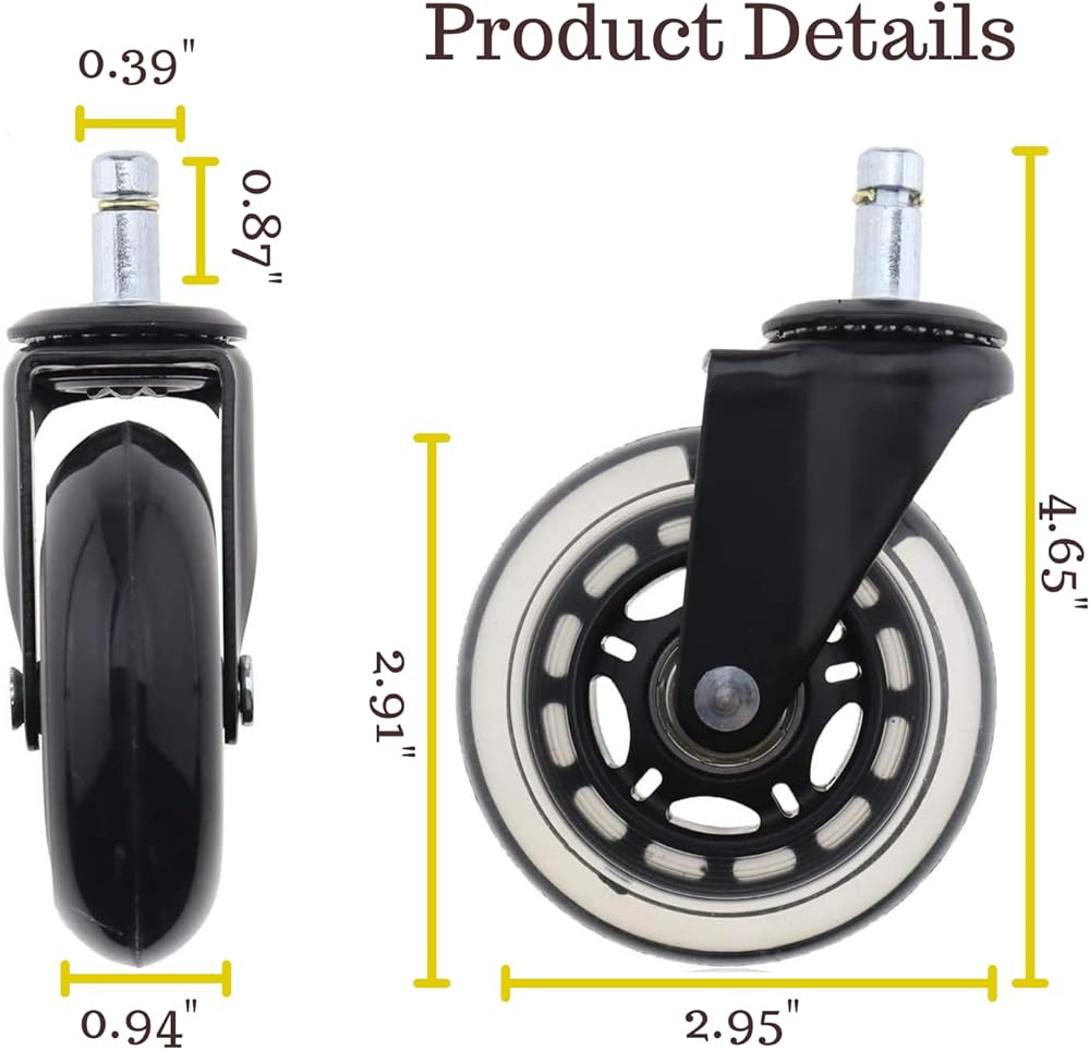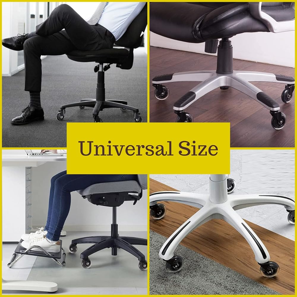 احمِ أرضياتك: توقف عن إتلاف الأرضيات الصلبة باهظة الثمن. تستخدم العديد من عجلات الكراسي مواد رخيصة ومنخفضة الجودة تدمر أرضيتك. لن يؤدي استبدال عجلات كرسي المكتب لدينا إلى خدش أو تلطخ أو إتلاف أرضياتك أبدًا. استمتع بانزلاق آمن وخالي من الهموم على الأرض.