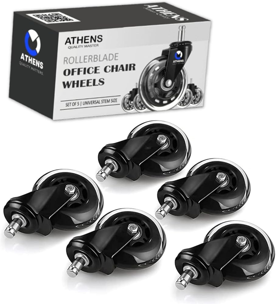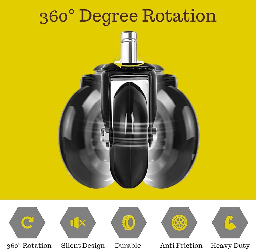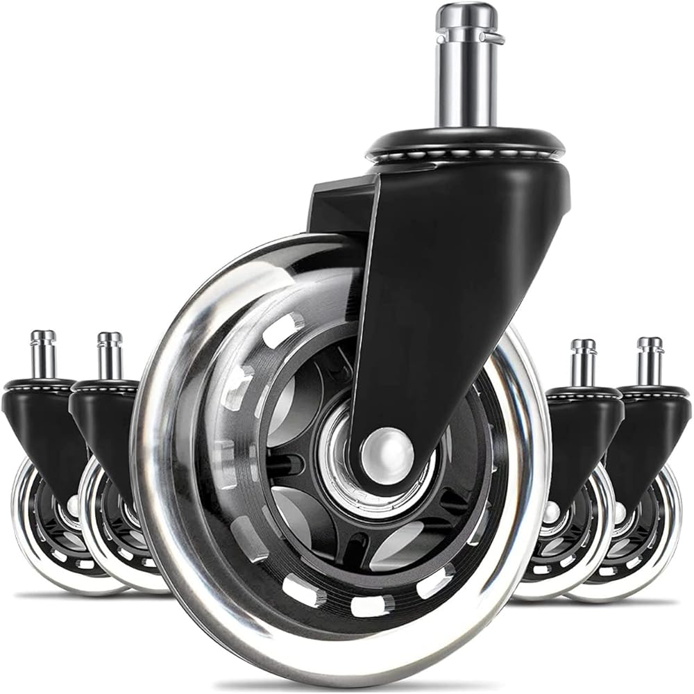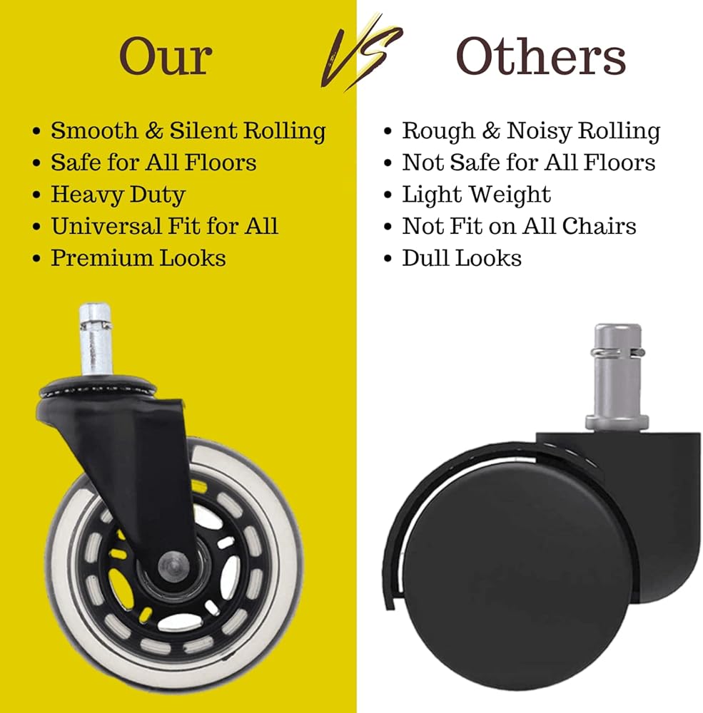 احمِ أرضياتك: توقف عن إتلاف الأرضيات الصلبة باهظة الثمن. تستخدم العديد من عجلات الكراسي مواد رخيصة ومنخفضة الجودة تدمر أرضيتك. لن يؤدي استبدال عجلات كرسي المكتب لدينا إلى خدش أو تلطخ أو إتلاف أرضياتك أبدًا. استمتع بانزلاق آمن وخالي من الهموم على الأرض.