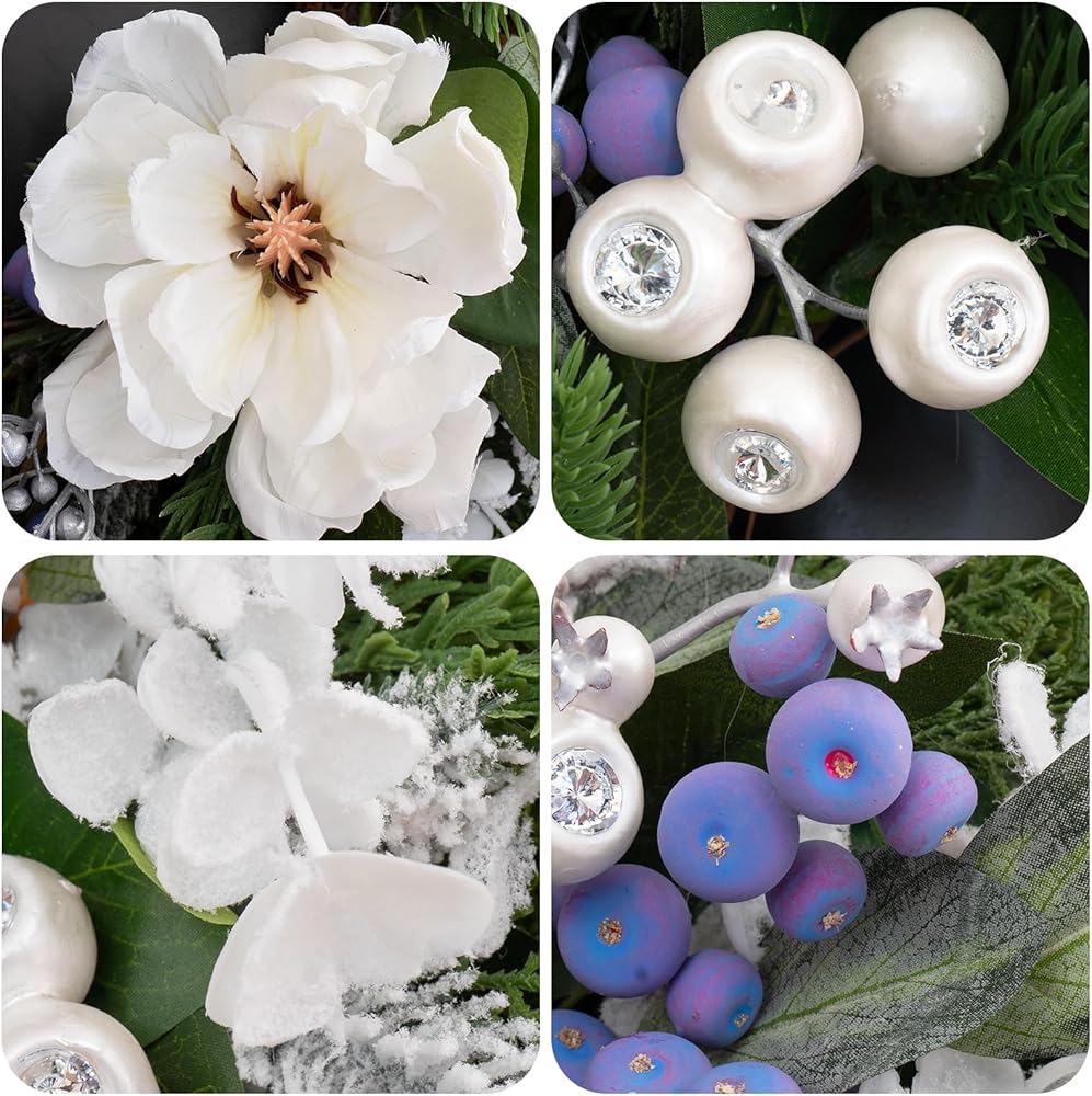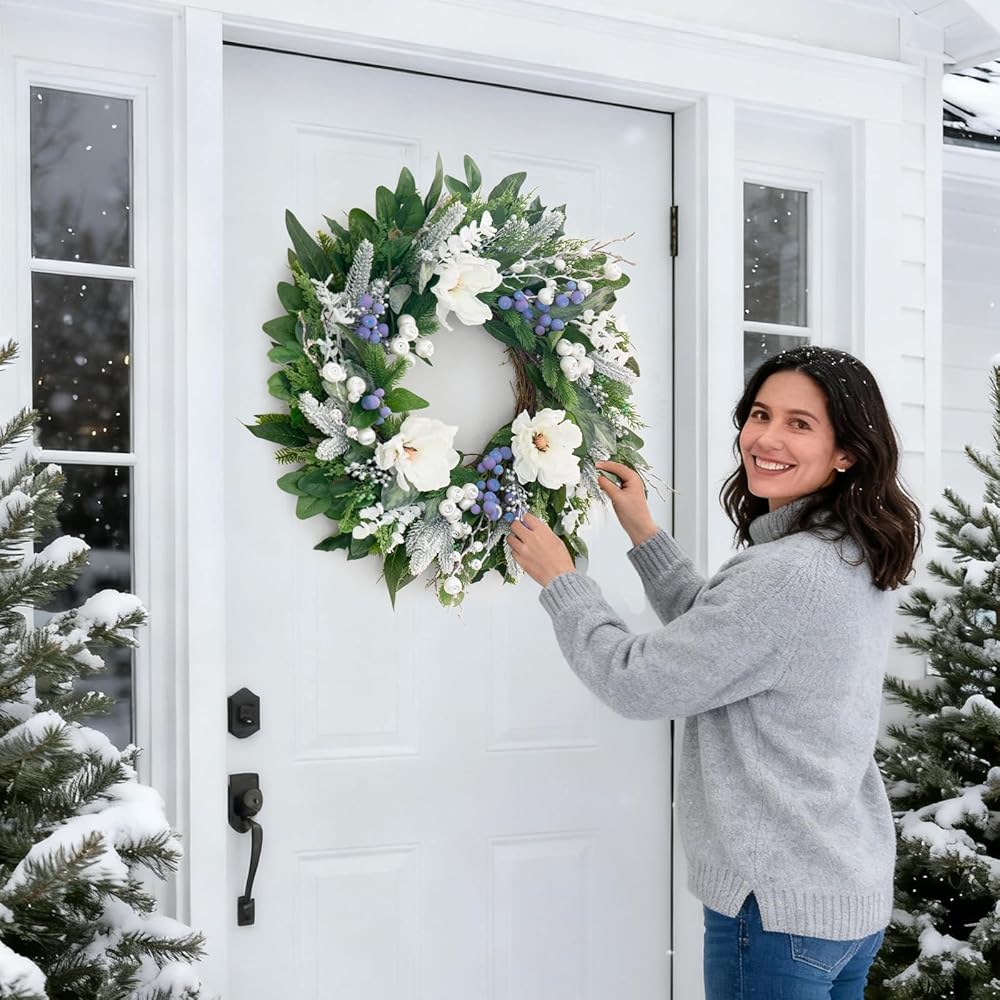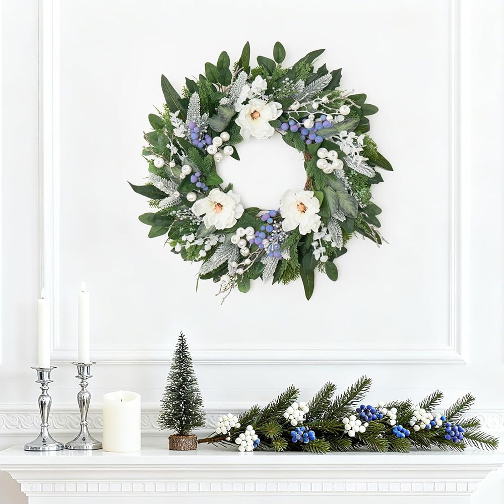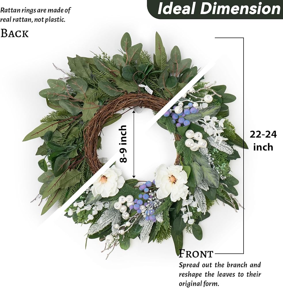 أكاليل الشتاء للباب الأمامي 24 بوصة إكليل عيد الميلاد والشتاء مع زهور بيضاء، التوت الأزرق، الأوكالبتوس، إكليل عيد الميلاد في الهواء الطلق، ديكور منزلي للعطلات الشتوية