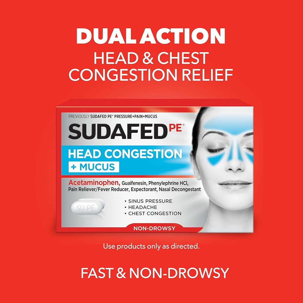 Sudafed PE Head Congestion + Mucus Tablets relieves sinus pain & pressure, headache, and nasal & chest congestion. Each non-drowsy tablet contains 325 mg of acetaminophen, a pain reliever and fever reducer; 5 mg of phenylephrine HCl, a nasal decongestant; and 200 mg of guaifenesin, an expectorant. Sudafed PE Head Congestion + Mucus Tablets temporarily relieve symptoms associated with hay fever, respiratory allergies, and the common cold, such as sinus pressure, headaches, nasal and chest congestion, excess mucus, and minor aches and pains. This non-drowsy congestion relief medicine also helps loosen mucus to thin bronchial passageways and make coughs more productive. Get powerful head congestion relief from the #1 pharmacist recommended brand among oral OTC decongestants.