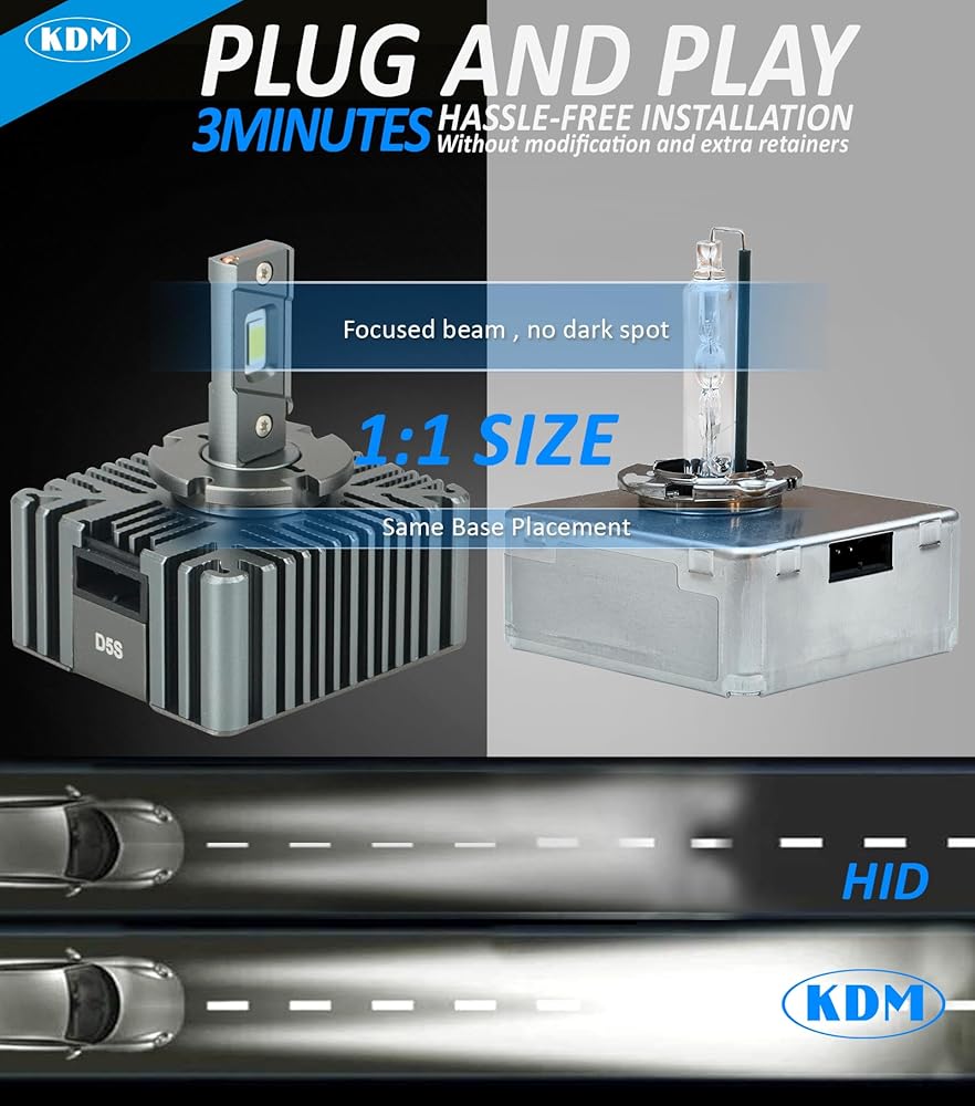 【تثبيت بسيط】 KDM D5S LED مصابيح LED مصممة مصممة لاسلكيا ، ما يقرب من 1: 1 حجم لمبات HID تضمن التثبيت السريع والسهل ، عدم الاستقطاب ، المكونات والتشغيل.