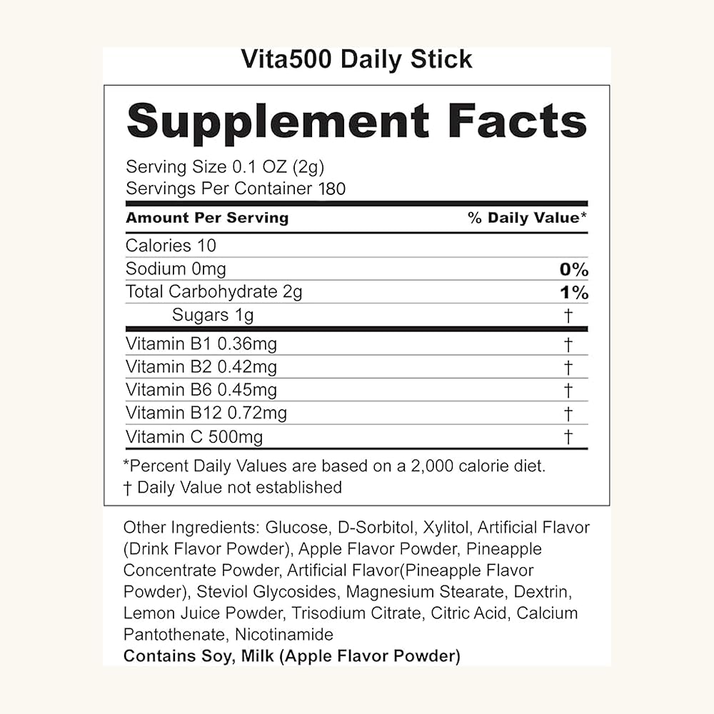 ممتازة لجميع الأعمار-تقدم Vita500 Daily Stick طريقة منعشة وخالية من الكافيين والتحول السريع لأخذ الفيتامينات الخاصة بك. مع عدم وجود ألوان مصطنعة أو محليات ، فهي مناسبة لكل من الأطفال والبالغين ، مما يجعل تناول فيتامين تجربة ممتعة