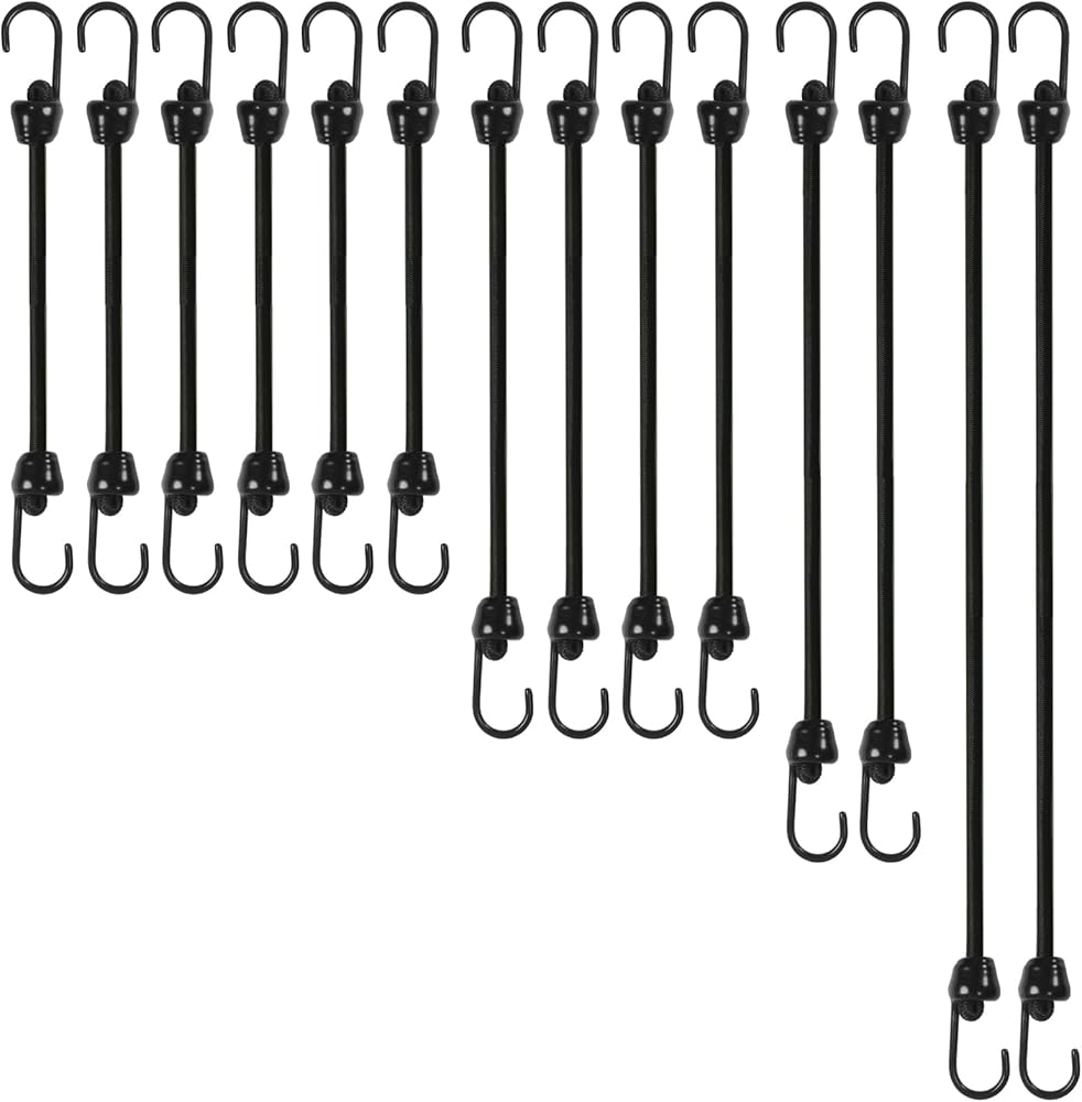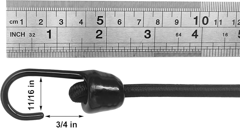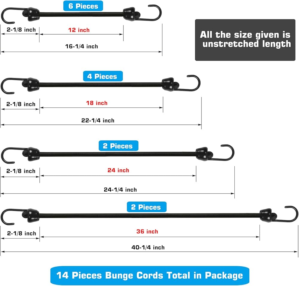 حبال بنجي صغيرة مع خطافات حجم متنوعة من 12 بوصة ، 18 بوصة ، 24 بوصة وطول 36 بوصة ، خطافات معدنية تراجع من الدرجة البحرية دون نهاية حادة ، 1/4 بوصة الحبل المطاطي