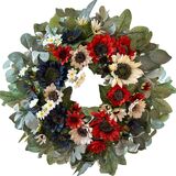 ②【 4 يوليو إكليل من الزهور】-إكليل إكليل من 4 يوليو من يوليو مصنوع يدويًا وهو مصنوع من زهور عباد الشمس الاصطناعية عالية الجودة التي يتم ترتيبها بشكل جميل على قاعدة أغصان الخشب الطبيعية. يتميز هذا الخلق المذهل بأزهار وأوراق الشمس ، وهي مثالية لخلق أجواء طبيعية في المساحات الداخلية أو الخارجية.