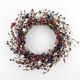 PATRIOTIC DESIGN: Handcrafted wreath featuring red, white, and blue stars, berries, and decorative elements perfect for American holiday celebrations