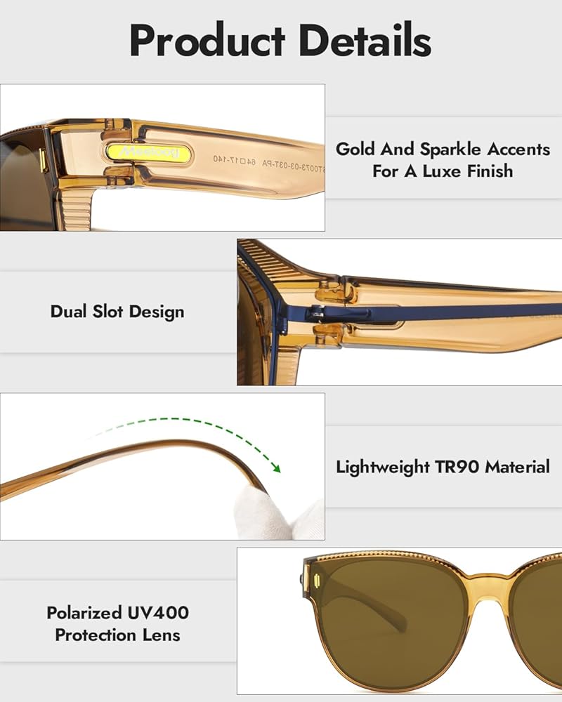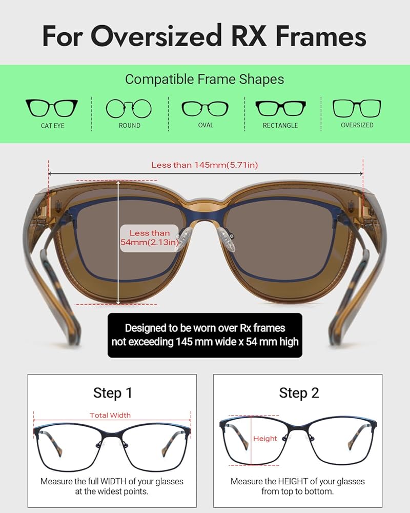 فوق النظارات الشمسية ، هيكل إطار مصمم خصيصًا لتكديس العدسة. الطول الداخلي 54 مم × طول العرض 145 مم ، متوافق مع 90 ٪ RX وإطارات القراءة (العرض الموصى به <145 مم). شكل كبير كلاسيكي مع معابد زخرفية ، أنيقة عندما تلبس وحدها.