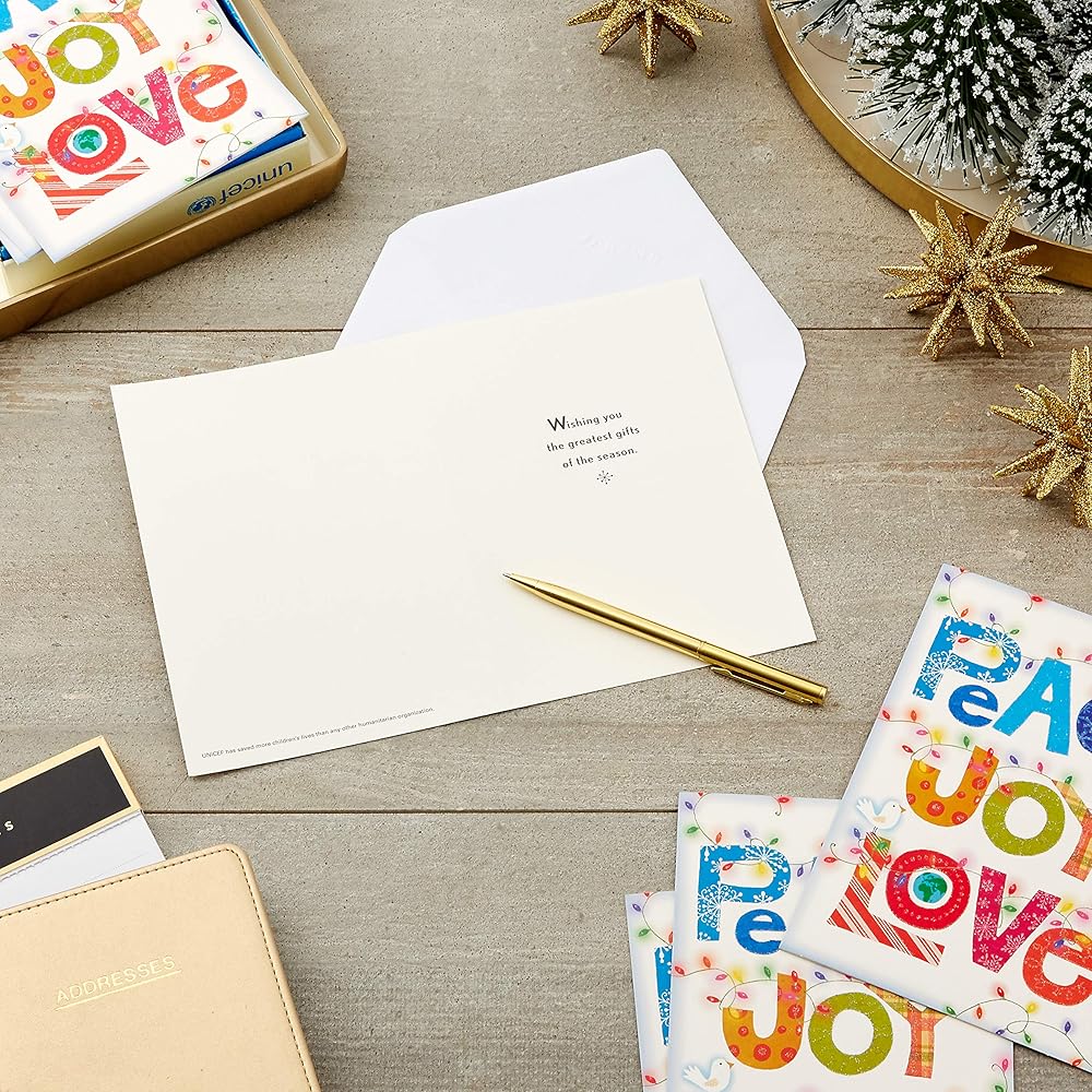 أرسل أمنيات دافئة إلى مستلم بطاقة العطلة هذا العام مع بطاقات عيد الميلاد هذه التي تتميز بتصميم شجرة السلام الجميلة اللامعة والتمنيات لقضاء عطلة جميلة. مع 12 بطاقة و13 ظرف، تحتوي هذه العبوة على الكمية المناسبة لمشاركة تهنئة العطلات مع الأصدقاء والعائلة الأقرب إليك. اشتر عدة عبوات لإرسال أمنيات عيد الميلاد للجميع على قائمتك. سيتم التبرع بجزء من المبيعات من هذه المجموعة في صندوق. علامة هولمارك التجارية معروفة على نطاق واسع بأنها الأفضل لبطاقات المعايدة ولفائف الهدايا وغيرها. منذ أكثر من 100 عام، تساعد هولمارك عملائها على جعل اللحظات اليومية أكثر جمالاً والاحتفالات أكثر متعة.