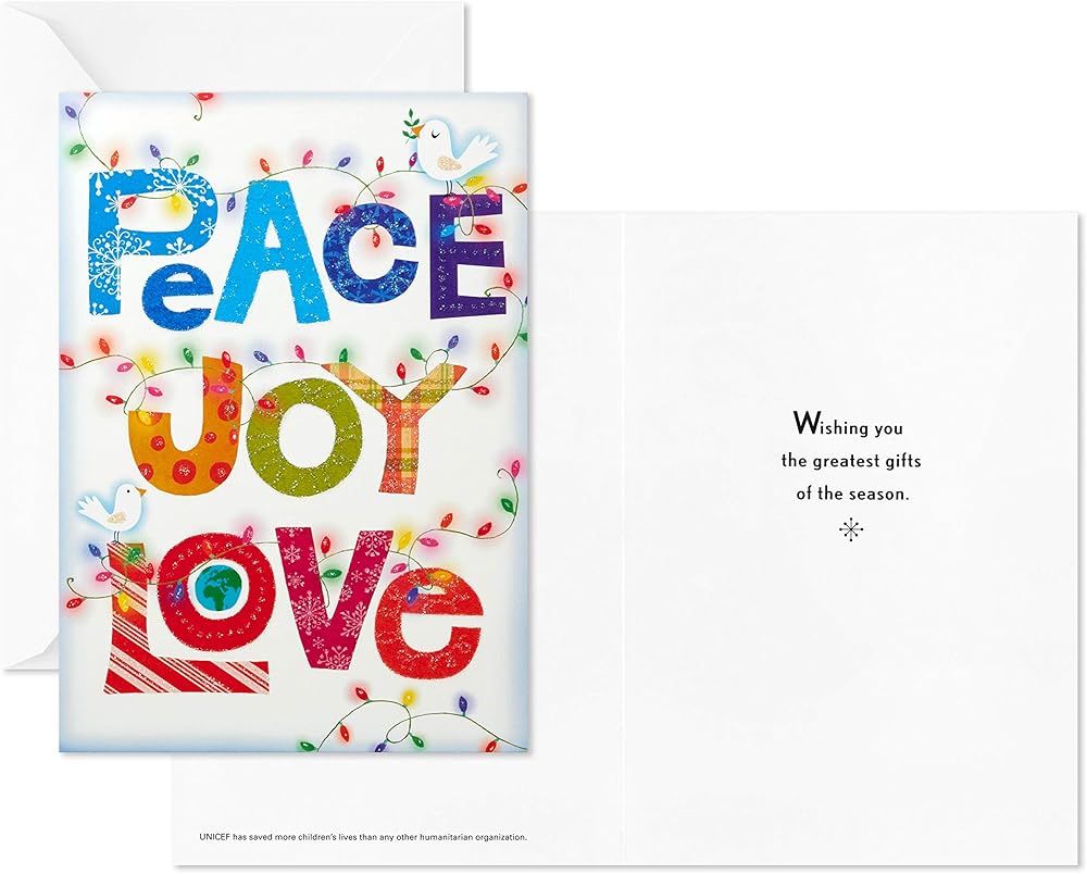 • تتميز بطاقات الكريسماس بشجرة مصنوعة من رسائل السلام بلغات مختلفة، ومزينة بلمعة. مكتوب عليه من الداخل: "موسم من الخير والسلام لك."
