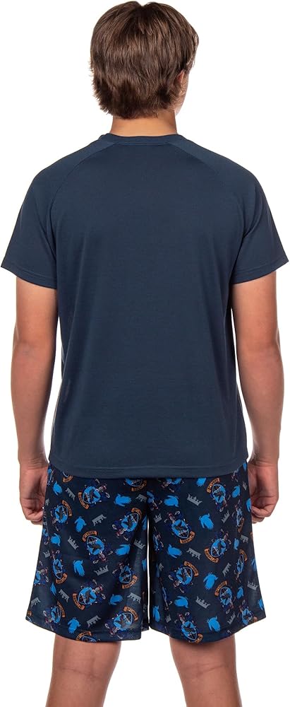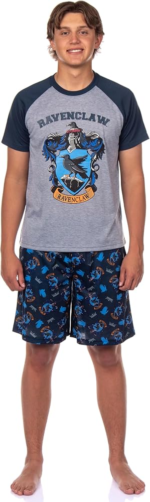 - Bold House Crest Display-تتميز Raglan Top بأكمام قصيرة بأكمام Hogwarts House كبيرة الواجهة الأمامية لأسلوب الشخصيات البارزة.