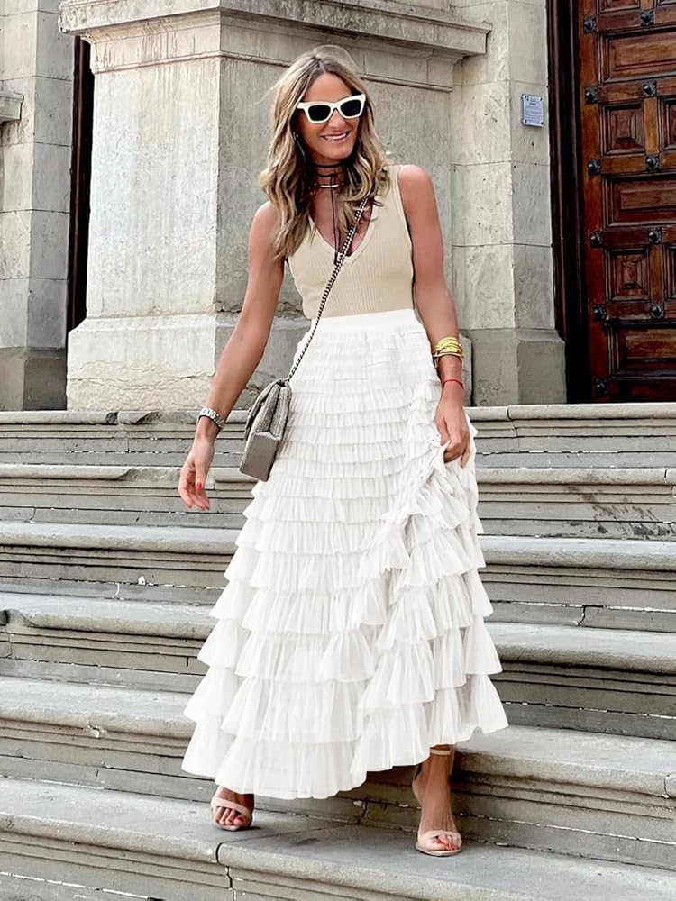 - المباراة: تنورة طويلة تول للنساء ، تسير على ما يرام مع الدبابات والكاريات والقمصان والسترات النسبية والسترة أو الشقق أو الكعب لإلقاء نظرة أنيقة.