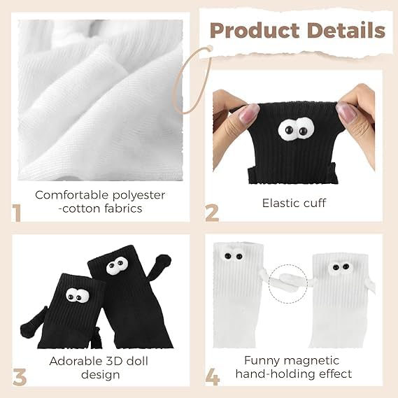 🧦【 تفاعل لطيف وممتع】 هل تبحث عن طريقة ممتعة وفريدة من نوعها للزوجين ، صديقها ، أفضل الأصدقاء للحفاظ على قرب؟ الجوارب القابضة ثلاثية الأبعاد لها جاذبية مغناطيسية تسبب أيدي الدمية في الاحتفاظ ببعضها البعض عند الاقتراب ، مما يجعل ردود فعل مذهلة وابتسامات كبيرة. من المؤكد أنهم سيضيفون لمسة فرحان وحميم إلى أي يوم زوجين!
