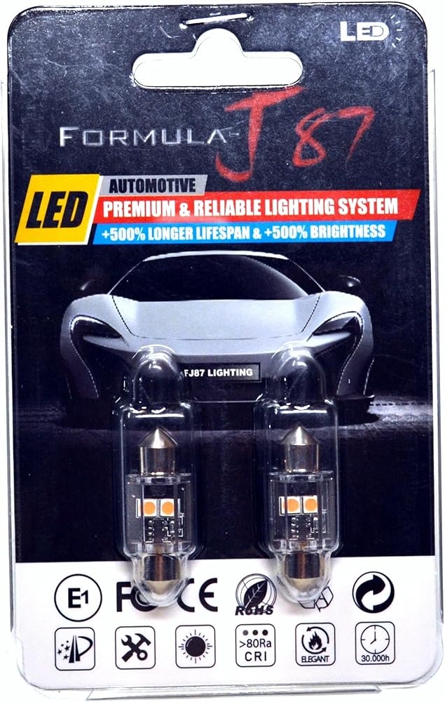 Formula-J87 LED Bulbs 3030 SMD 31mm DE3175 DE3021 DE3022 – Interior Dome, Map, Door, Trunk, Cargo, Glove Box Light Replacement (Pack of 2) Key Features: Easy Installation: Plug-and-play design for hassle-free installation. Direct Fitment: Compatible with DE3175, DE3175LL, DE3021, DE3021LL, DE3022, DE3022LL, DE3023, 3021, 3022, 3175, 6428, 6614F, 6430, and more. Perfect Size: Length: 31mm (1.25 inches). Enhanced Performance: Built-in constant current IC driver ensures stable performance. No polarity design for error-free installation. Aluminum body construction for superior heat dissipation and durability. Operates at low temperature with reduced power consumption, ensuring a longer lifespan. Superior Brightness & Luxury Look: Stock bulbs emit a dim, yellowish light that's barely noticeable. The Formula-J87 31mm LED festoon bulb delivers extreme brightness and a crisp, white light, giving your vehicle a sleek and luxurious appearance. Brightness Upgrade: Stock bulbs provide only 30-40 lumens, while these LED bulbs offer an impressive 200 lumens per bulb. Energy Efficiency: Power Usage: Stock bulbs consume 8 watts, while Formula-J87 LED bulbs draw only 1.5 watts, significantly reducing energy consumption. Upgrade your vehicle's interior lighting with Formula-J87 LED bulbs for brighter, energy-efficient, and luxurious performance.