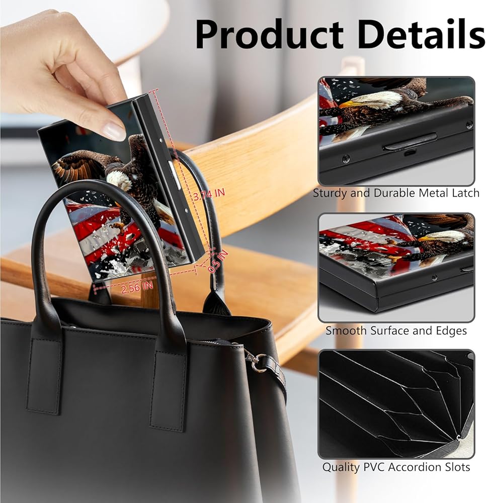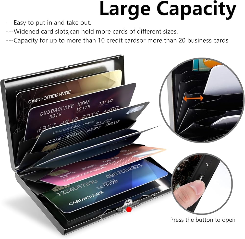 4.Small Size but Large Capacity:Our id wallet for women with 6 accordion-style slots.This business card holder can up to 10 cards or over 20 business cards,fit for various of cards such as credit card, ID card and metro card.Opening the card holder presents all the stored cards in a fanlike fashion, so that any specific card can be picked easily.