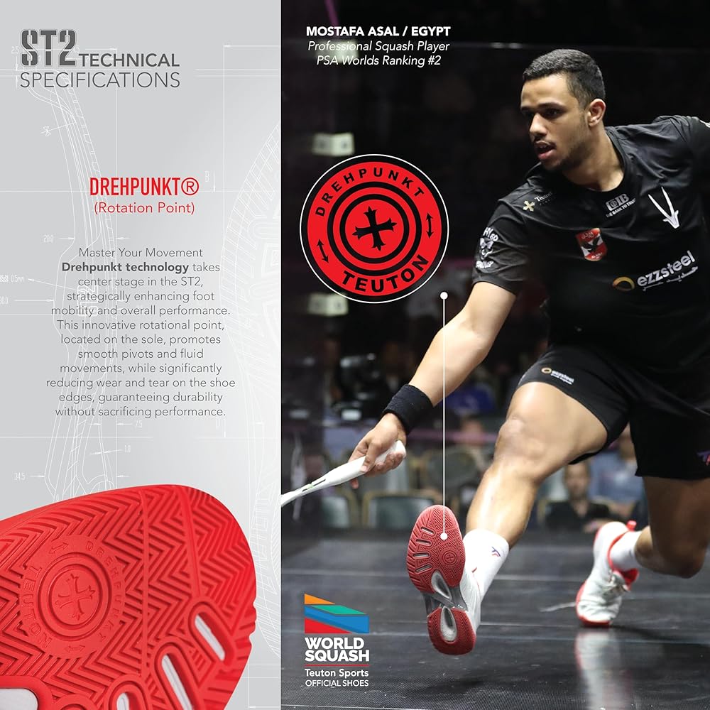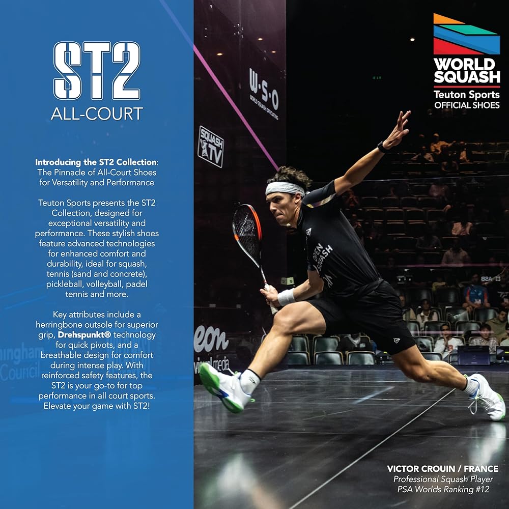 Elevate your game with the Teuton Sports ST2 Unisex All-Court Shoes. Perfect for tennis, squash, pickleball, volleyball, and padel, these lightweight and breathable sneakers provide exceptional comfort and support. Featuring a herringbone outsole for superior grip and Drehpunkt technology for agile movement, the ST2 ensures you can pivot and move with confidence. Built with durability in mind, these shoes are available in four vibrant colors and sizes 37-48 EUR. Dominate the court and unleash your potential with the Teuton Sports ST2!
