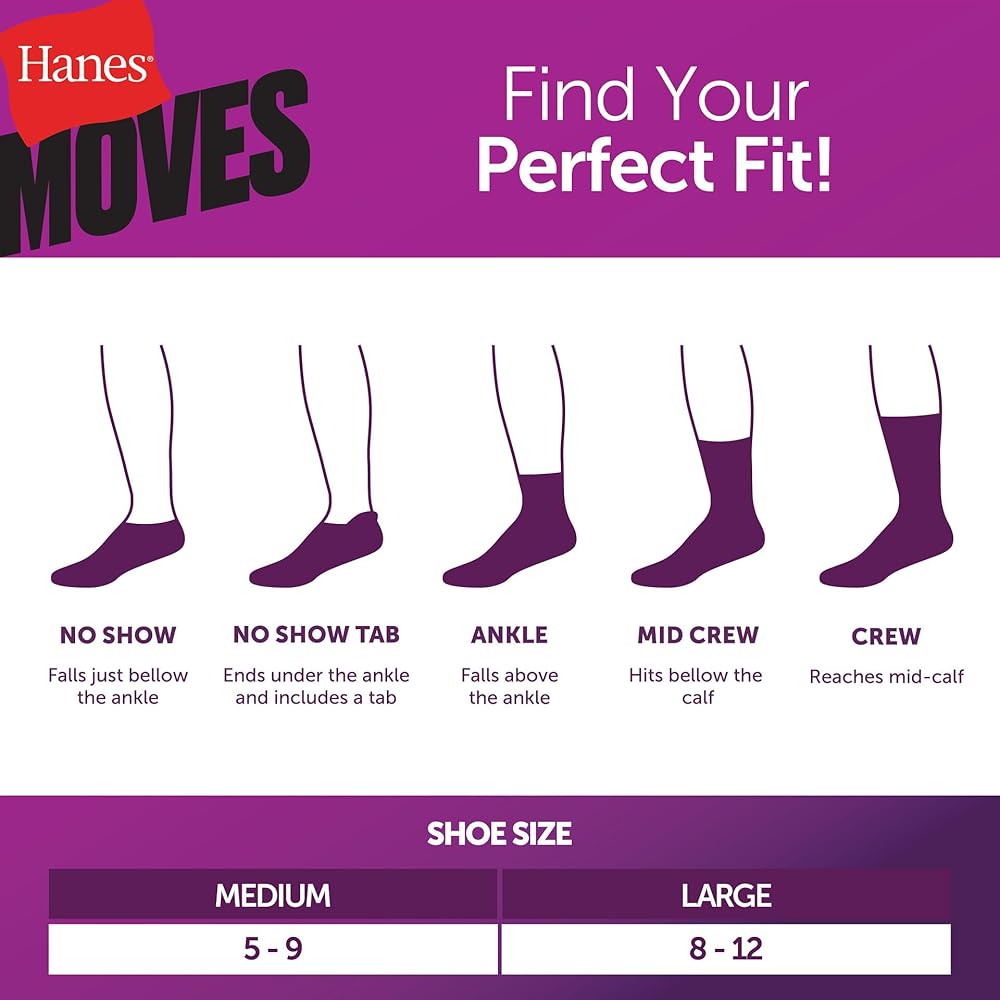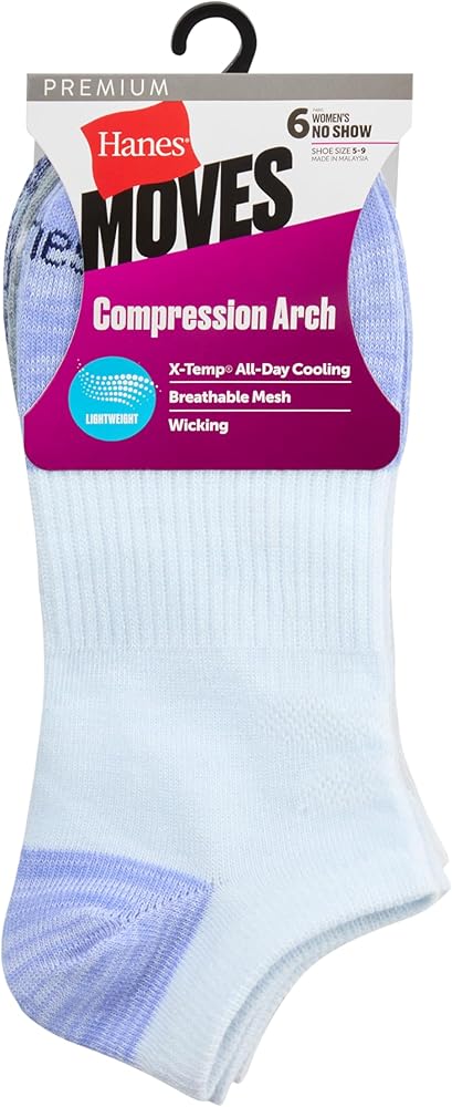 Hanes® women's lightweight performance no-show socks offer a non-cushioned layer of comfort and protection without the bulk. A compression arch provides a performance fit around the foot, while Cool Comfort®'s moisture-wicking fabric helps keep feet cool and comfy. Built with X-Temp™ technology, these socks are designed to adapt to your temperature for all-day comfort. Best of all, the no-show length of these women's socks stays hidden beneath many shoes - making them the perfect match for low-cut sneakers and more. Available in a convenient multi-pack, these no-show socks are a sock drawer essential.