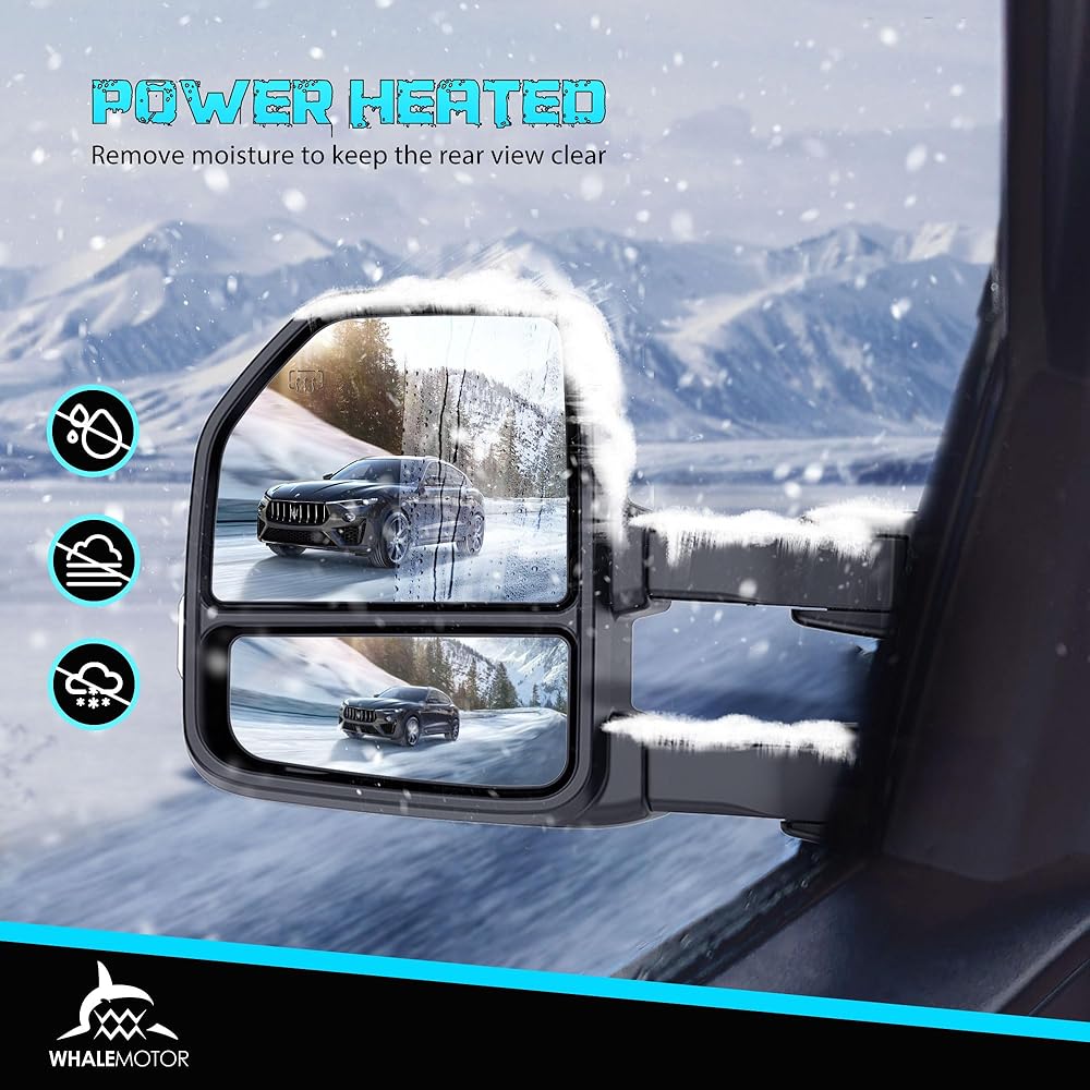 • الطاقة المسخنة: يساعد عنصر التدفئة الكهربائية داخل زجاج المرآة على إزالة الجليد بسرعة وتطهير أي رطوبة ، وهو أمر مهم للغاية عند السحب في الظروف الجوية القاسية.