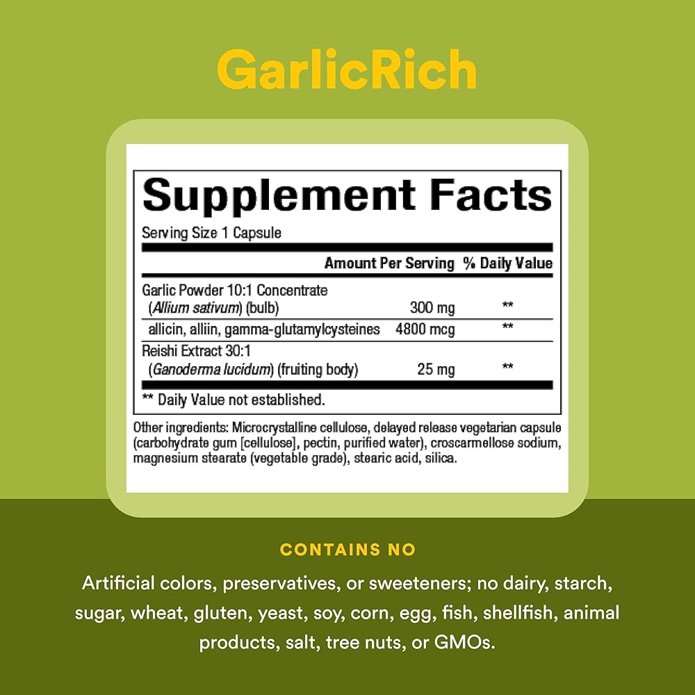 GarlicRich Garlic+Reishi provides support for the immune and cardiovascular systems. The 10:1 garlic concentrate is safe from pesticides and offers a full spectrum of important actives equal to 4.5 cloves of fresh garlic per capsule, while the potent 30:1 organic reishi mushroom extract provides additional adaptogenic support.