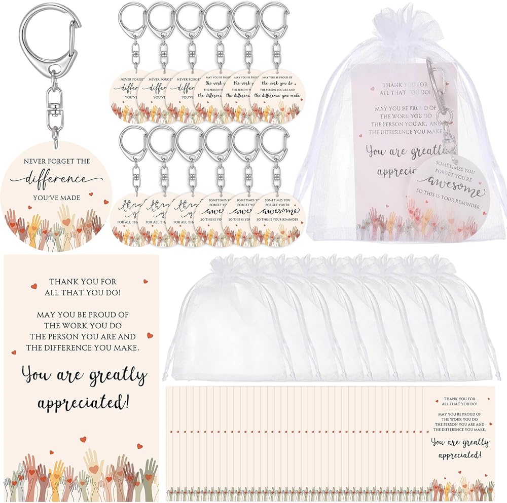 شكرًا لك مجموعة Keychain: تتضمن هدايا التقدير المتطوعين 48 سلاسل مفاتيح أكريليك في 4 تصميمات مميزة و 48 بطاقات شكر و 48 أكياس أورجانية ؛ إنه يوفر حزمة منسقة وظيفية تجعل الهدايا سهلة ومدروسة ، مثالية لإظهار التقدير للمتطوعين وأعضاء الفريق