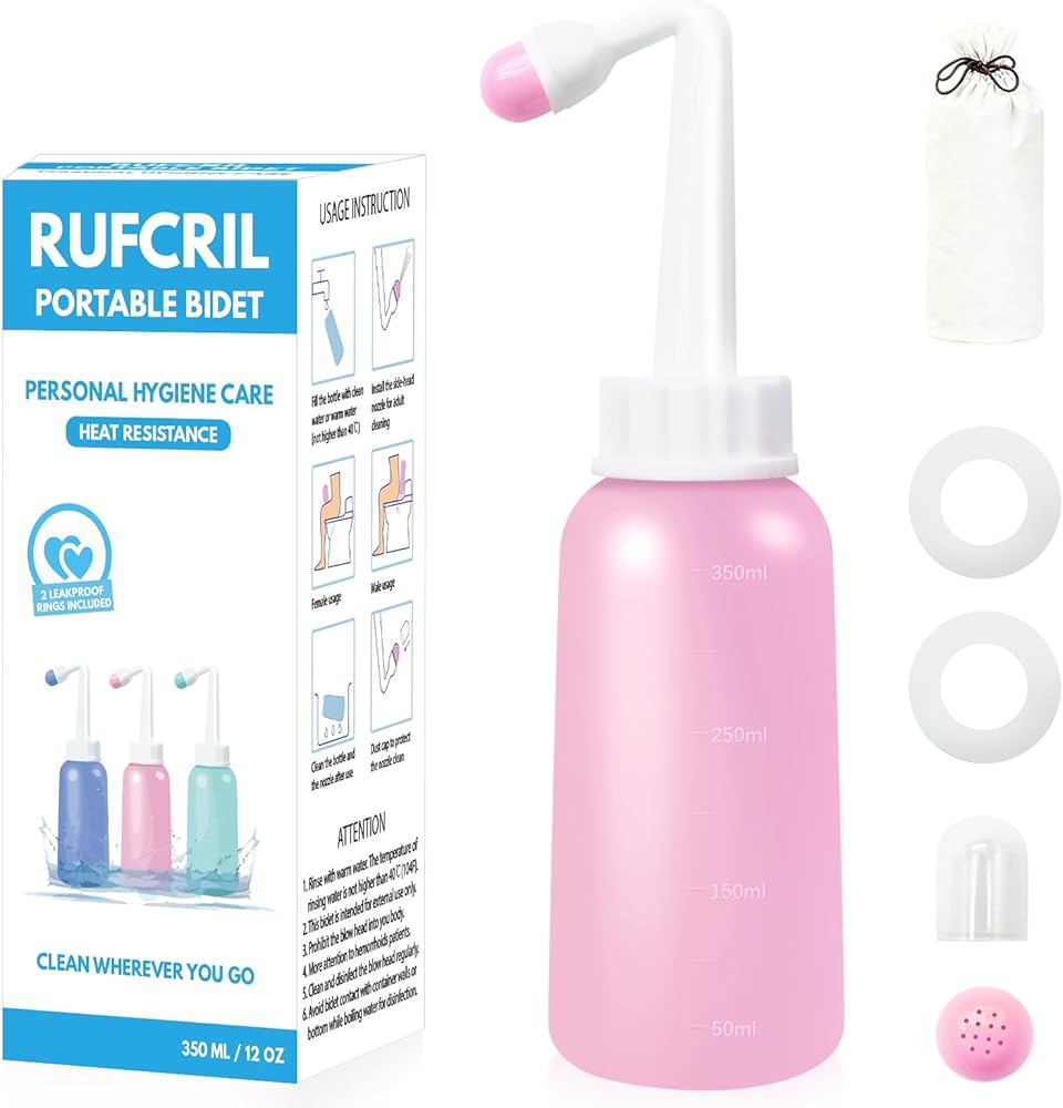 زجاجة Rufcril mini peri ، بيديت سفر محمول 350 مل مع حلقة إضافية وحقيبة ، مادة TPE لمقاومة درجة الحرارة العالية ، والضروريات لرعاية العجان بعد الولادة ، والعلاج النزفي ، والوردي