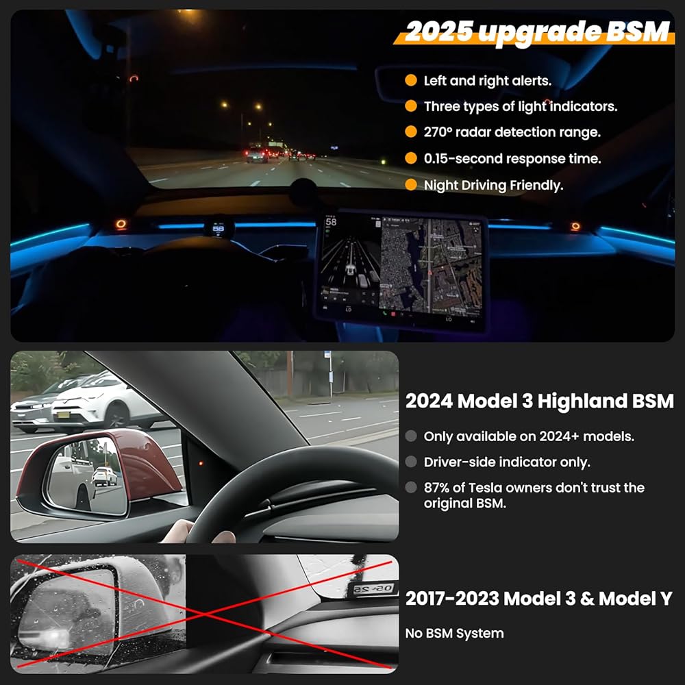 قم بإزالة البقع العمياء ، والقيادة مع الثقة (ترقية Gen 2nd) : مصمم خصيصًا لنموذج Tesla Model 3 & Model Y (2019-2023) ، يوفر نظام مراقبة البقع العمياء من الجيل الثاني اكتشافًا جانبيًا وخلفيًا في الوقت الفعلي. سواء كنت تقوم بتغيير الممرات أو التحول أو البدء من التوقف ، فإنه يقدم تحذيرات دقيقة لتحسين سلامة القيادة بشكل كبير وتقليل خطر الحوادث. القيادة مع راحة البال ، مع العلم أنك محمي من الأخطار الخفية على الطريق.