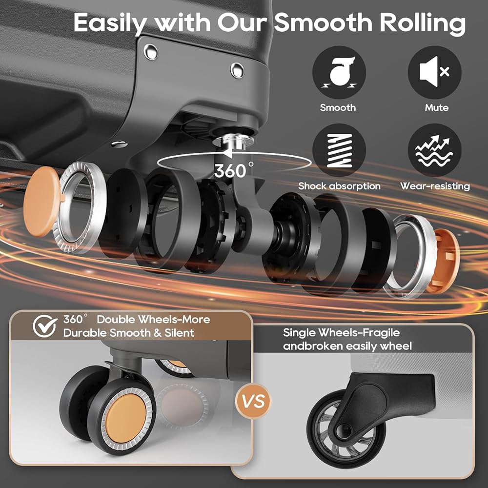 • عجلات ناعمة لسهولة المناورة: تم تجهيز هذه الأمتعة الصلبة على عجلات عالية الجودة ، مما يجعل الحركة بلا مجهود. تم تصميم العجلات للانزلاق بسلاسة ، مما يتيح لك التنقل بسهولة من خلال المطارات المزدحمة والشوارع المزدحمة. هذه الميزة مهمة بشكل خاص لأولئك الذين يسافرون بشكل متكرر ، لأنها تحول تجربة السفر الخاصة بك. يمكنك تحريك أمتعة السفر بسرعة وسهولة ، مما يجعل رحلتك أكثر متعة.