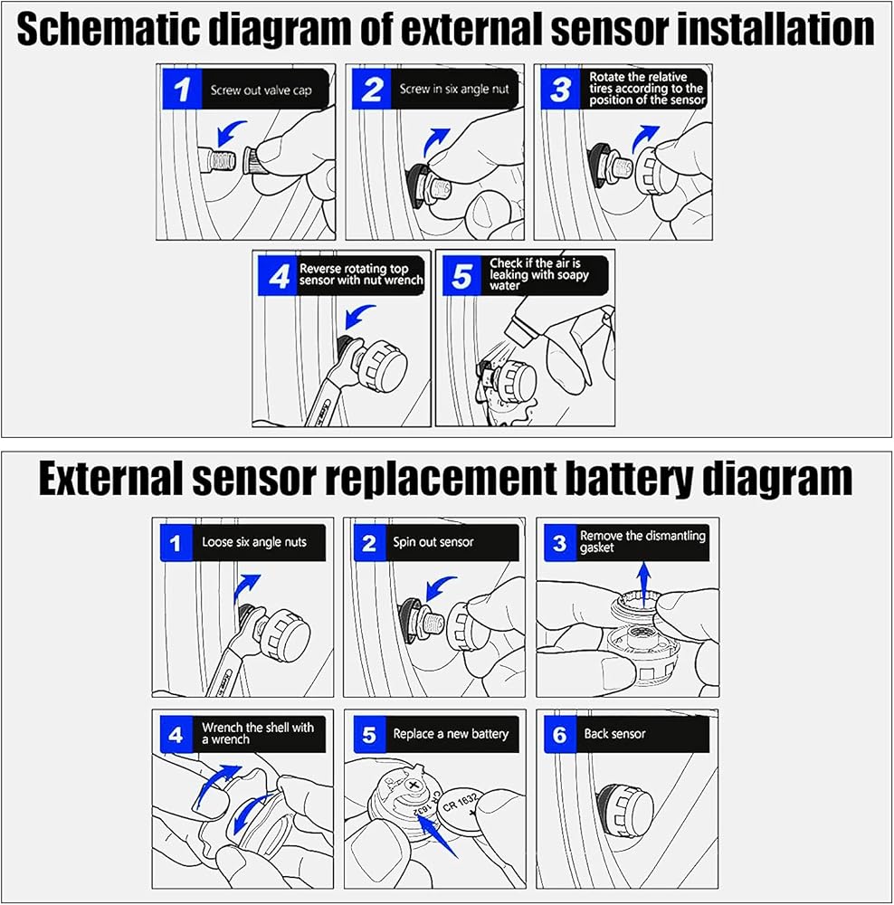【سهولة التركيب والتفكيك 】 1، قم بمسح رمز الاستجابة السريعة على البطاقة، ثم قم بالتنزيل والتثبيت. 2، يرجى اتباع علامة المستشعر وتثبيت المستشعر على الإطار المقابل حتى الحصول على تاريخ كل مستشعر، اكتمال التثبيت. يرجى التثبيت ببطء لجعل ضغط الهواء يلامس المستشعر بالكامل. (نطاق الضغط الذي يمكن ضبطه هو 1.5~92.6Psi، 0.1~6.4Bar.)