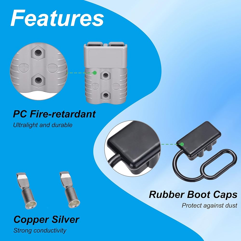 【Product Information】Anderson Connector This handy electrical wire connection set ncludes 2 clearly marked quick connect plugs that let you patch and disconnect 6 to 12 gauge (0.08"-0.16") wire pathways from 12V, 24V, 36V ,48V ,72V batteries, supporting currents up to 50 amps