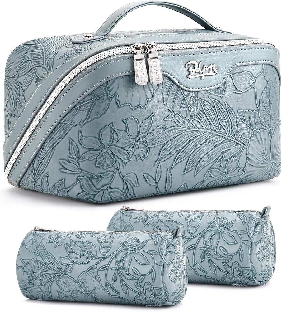 أكياس مكياج Boyatu Travel أكياس منظم مستحضرات التجميل: أكياس مكياج ذات قدرة كبيرة من 3 مجموعات - أكياس أدوات الزينة الجلدية للنساء - حقيبة محمولة مفتوحة على مصراعيها مع مقسم ومقبض (01 Light Blue)