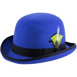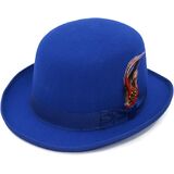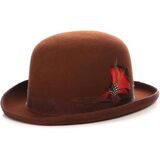 This sophisticated, traditional English Bowler / Derby hat by Ferrecci will add a timeless style to any outfit. Constructed of 100 percent wool felt, this hat is finished with a grosgrain ribbon trim, a feather accent and has a fully lined plush interior. Great for any distinguished gentlemans wardrobe or for dressing up in costume like your favorite character such as Charlie Chaplin or Alex DeLarge from the movie A Clockwork Orange.