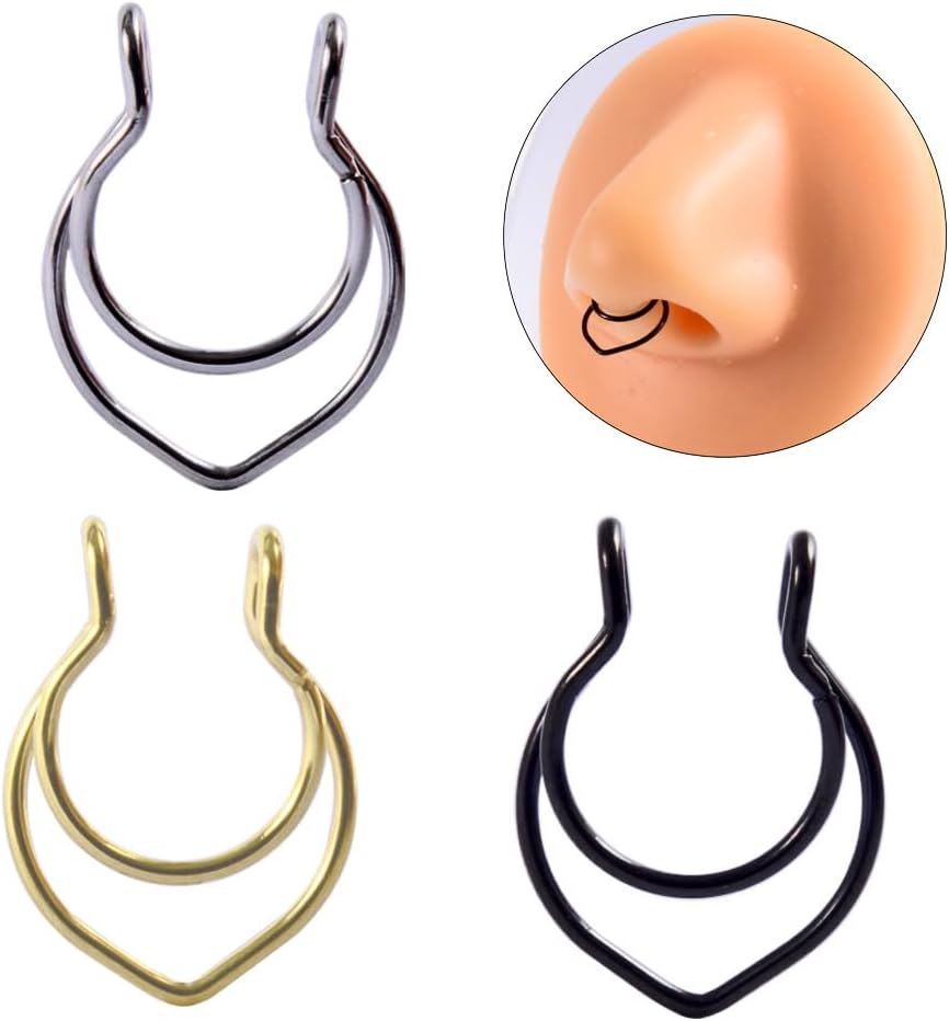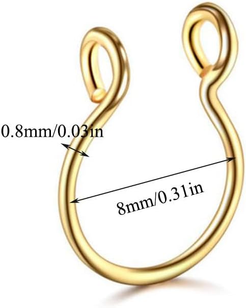 A great alternative to nose piercing! It will be a fashionable way to try the nose ring before it is actually pierced.This stunning fake nose rings keeps up with fashion trends.nickel and lead free, hypoallergenic, light weight premium stainless steel with long color retention and more texture. The softness of the stainless steel and copper wire allows for good size adjustment, making it easy to take and wear. The styles of various shapes, This fake nose ring is an artificial nose ring. No perforation is required.