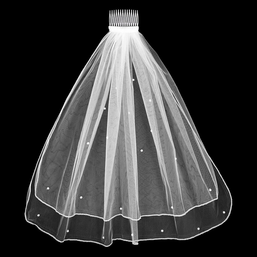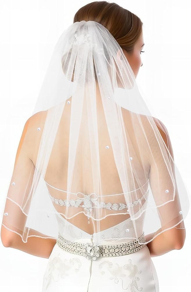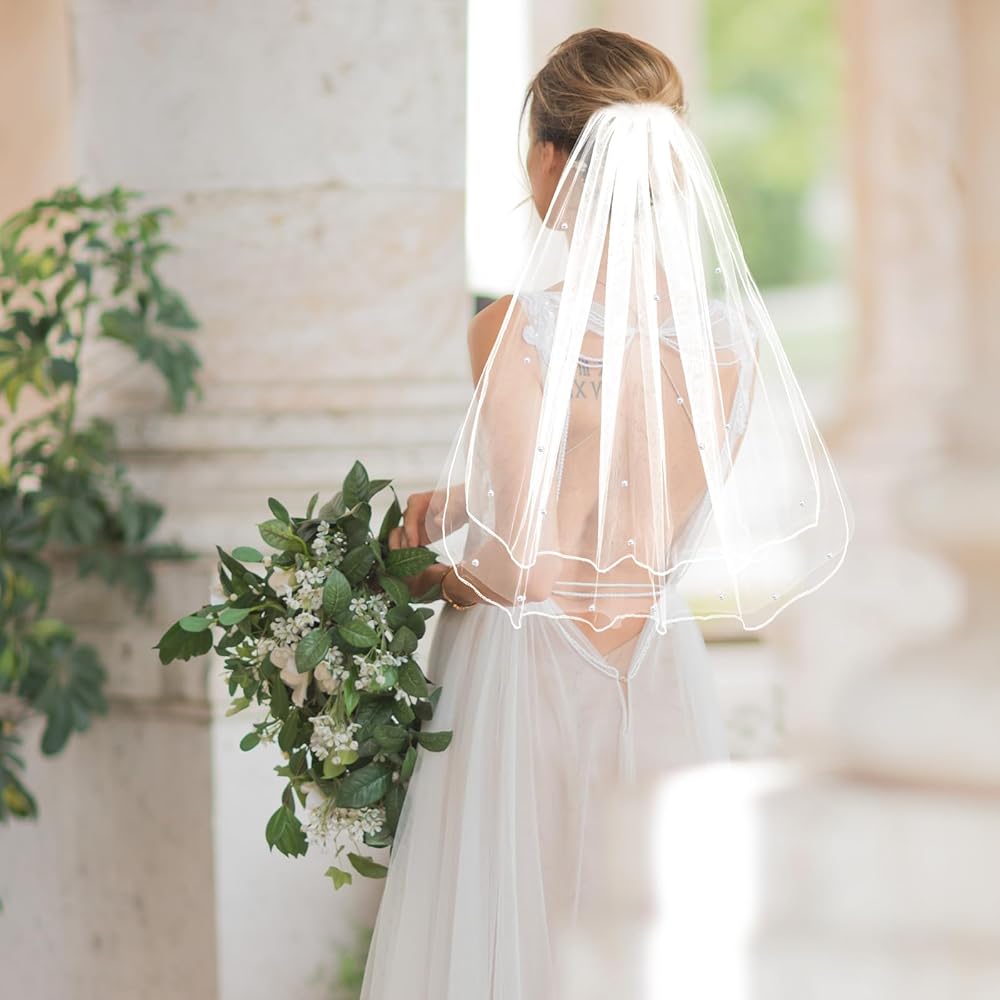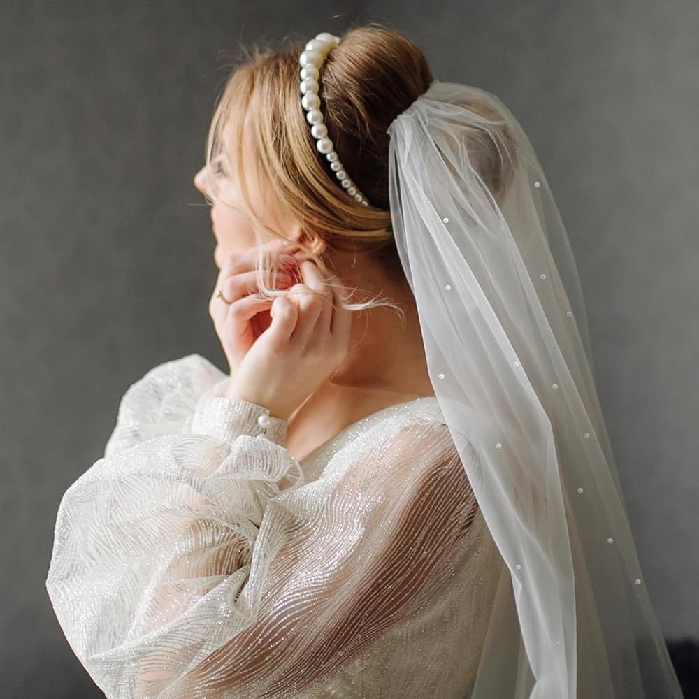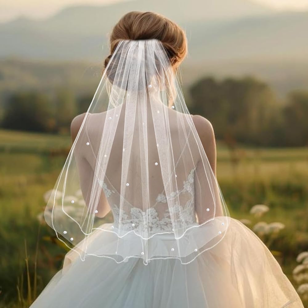 Elegant Short Veil: This short bridal veil is decorated with delicate pearls and beautiful rhinestones. The romantic design can enhance your bridal look. It can also be used as a headband decoration. It combines fashion and function